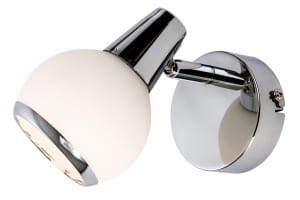Loris - kinkiet 1 płomienny chrom. 1xE14 40W. Wysokość 12cm. Szerokość 8cm. Głębokość 14cm. Klosz biały opal mat z chromowaną obręczą.