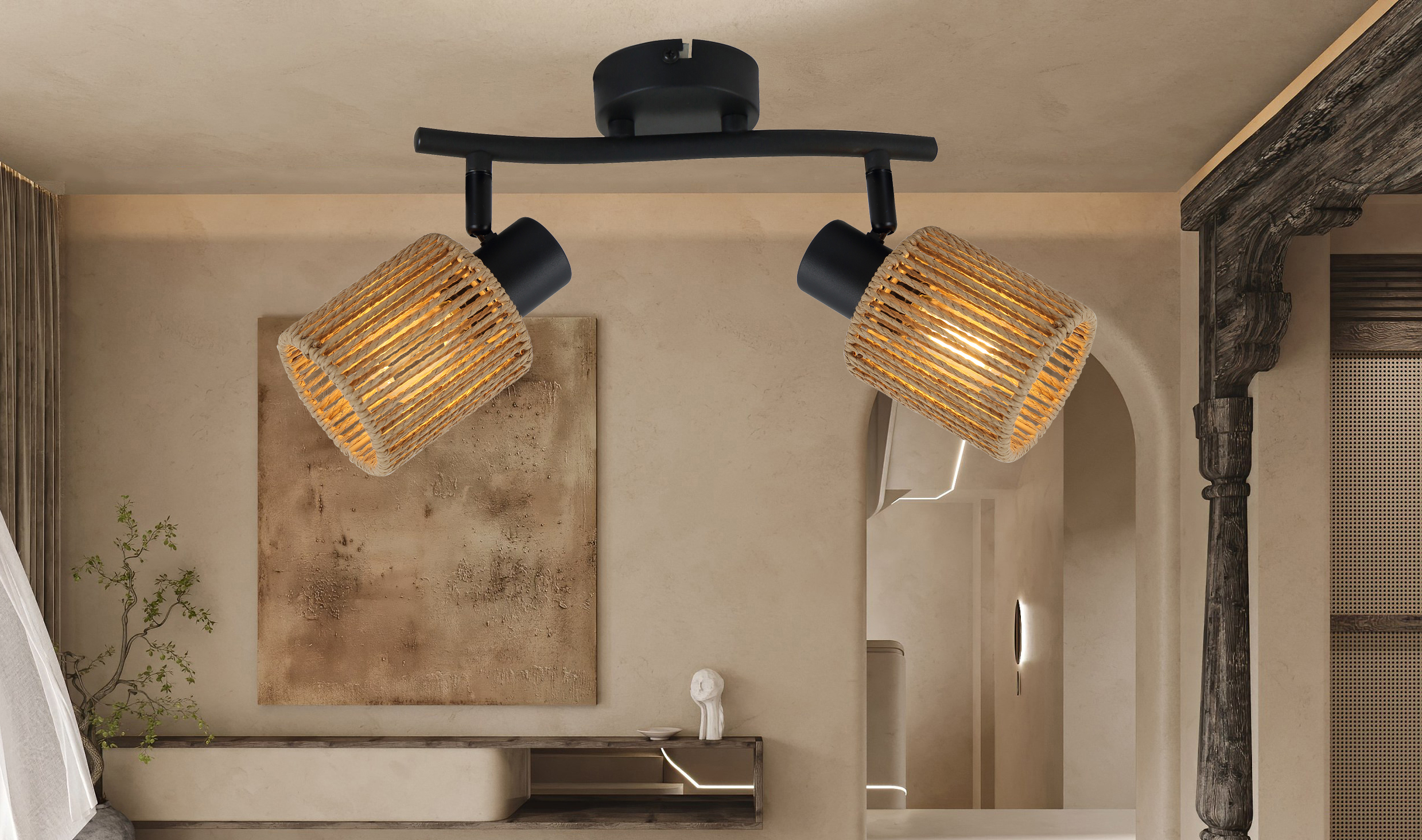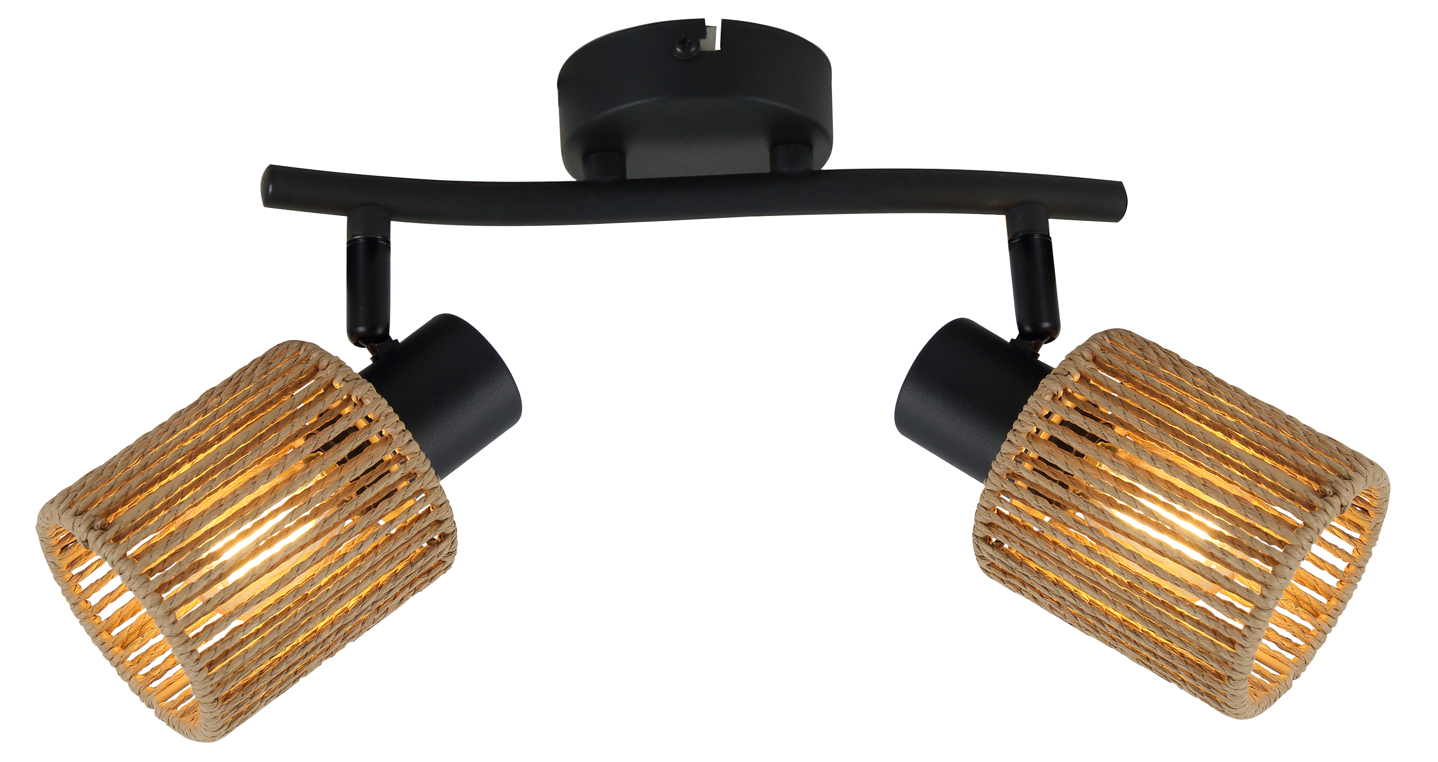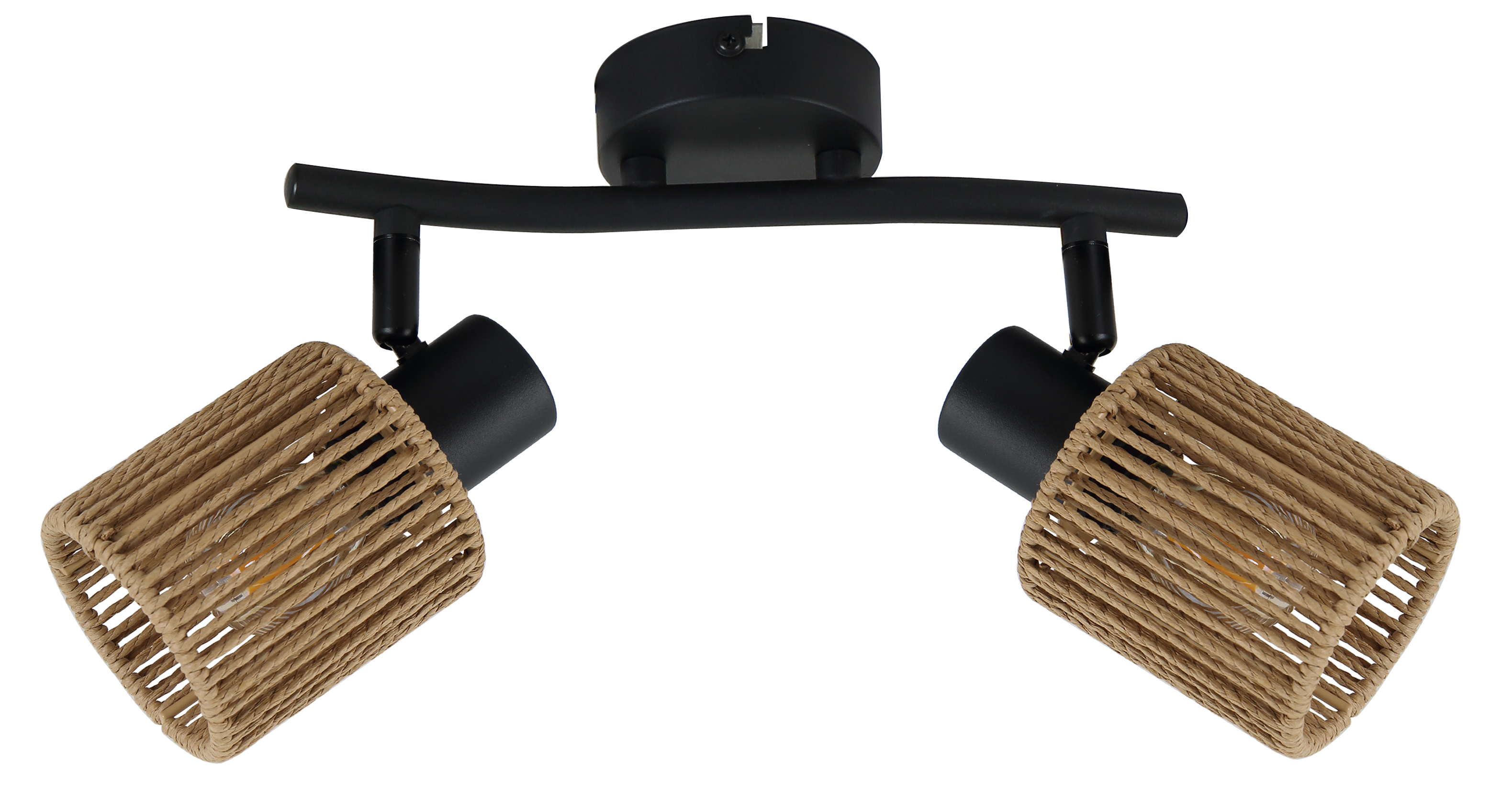 Arila kinkiet czarny mat. 2xE14 40W. Wysokość 14,5cm. Szerokość 25cm. Głębokość 8cm. Abażury z papierowego sznurka