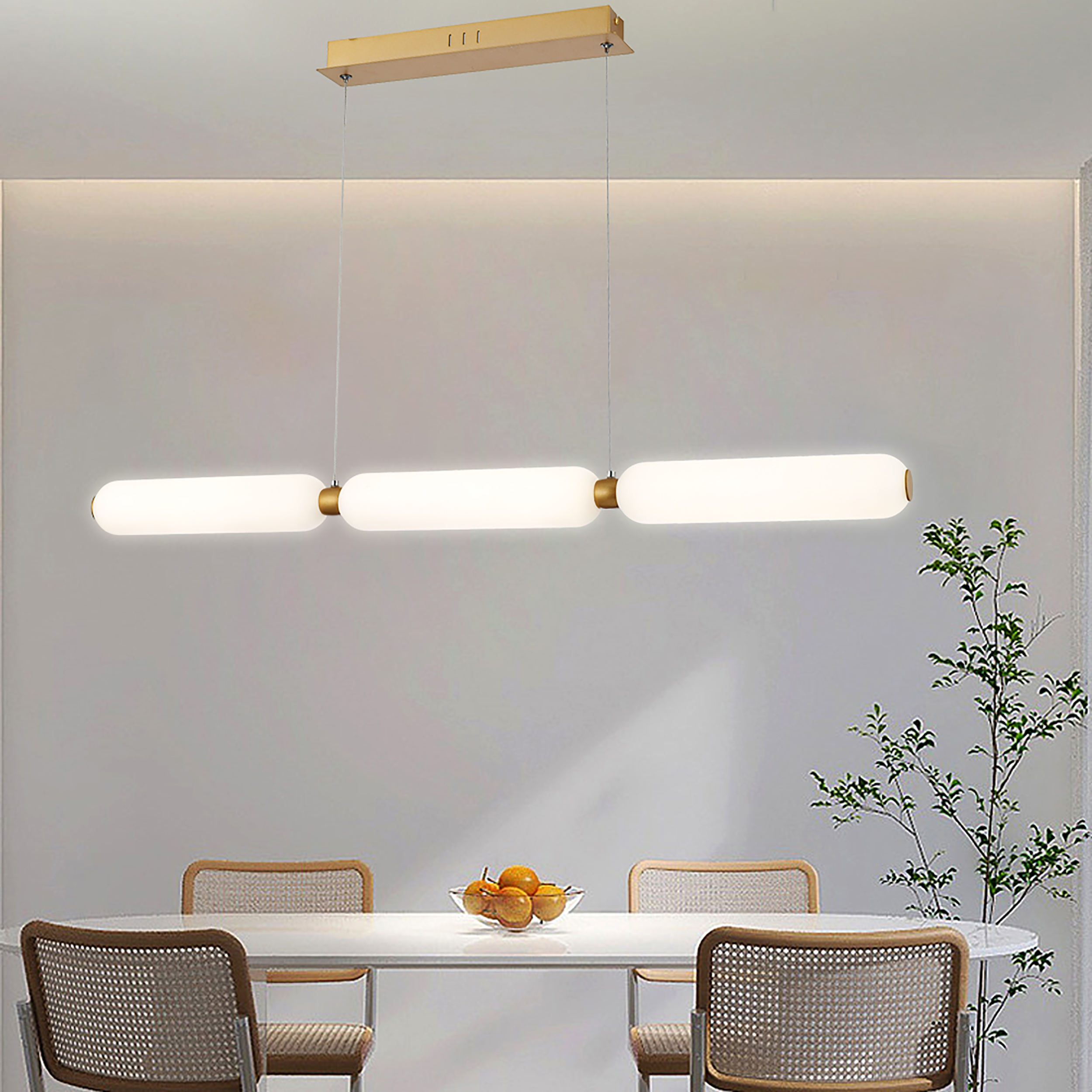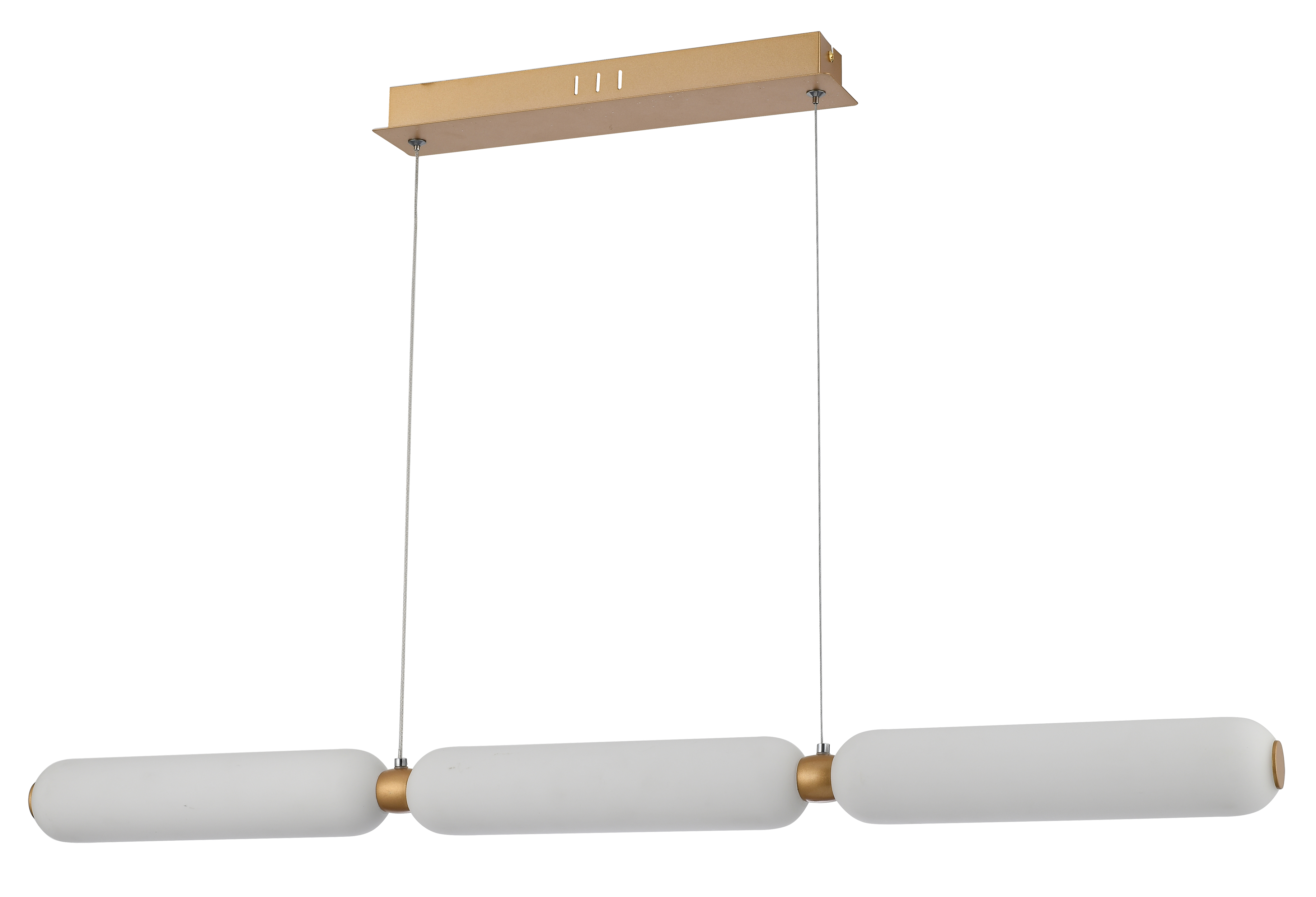 Catkin - lampka wisząca złoty malowany. 3x8W LED 1920Lm 4000K. Wysokość 7cm. Wysokość całkowita 120cm. Szerokość 92,5cm. Głębokość 7cm. Klosze szklane