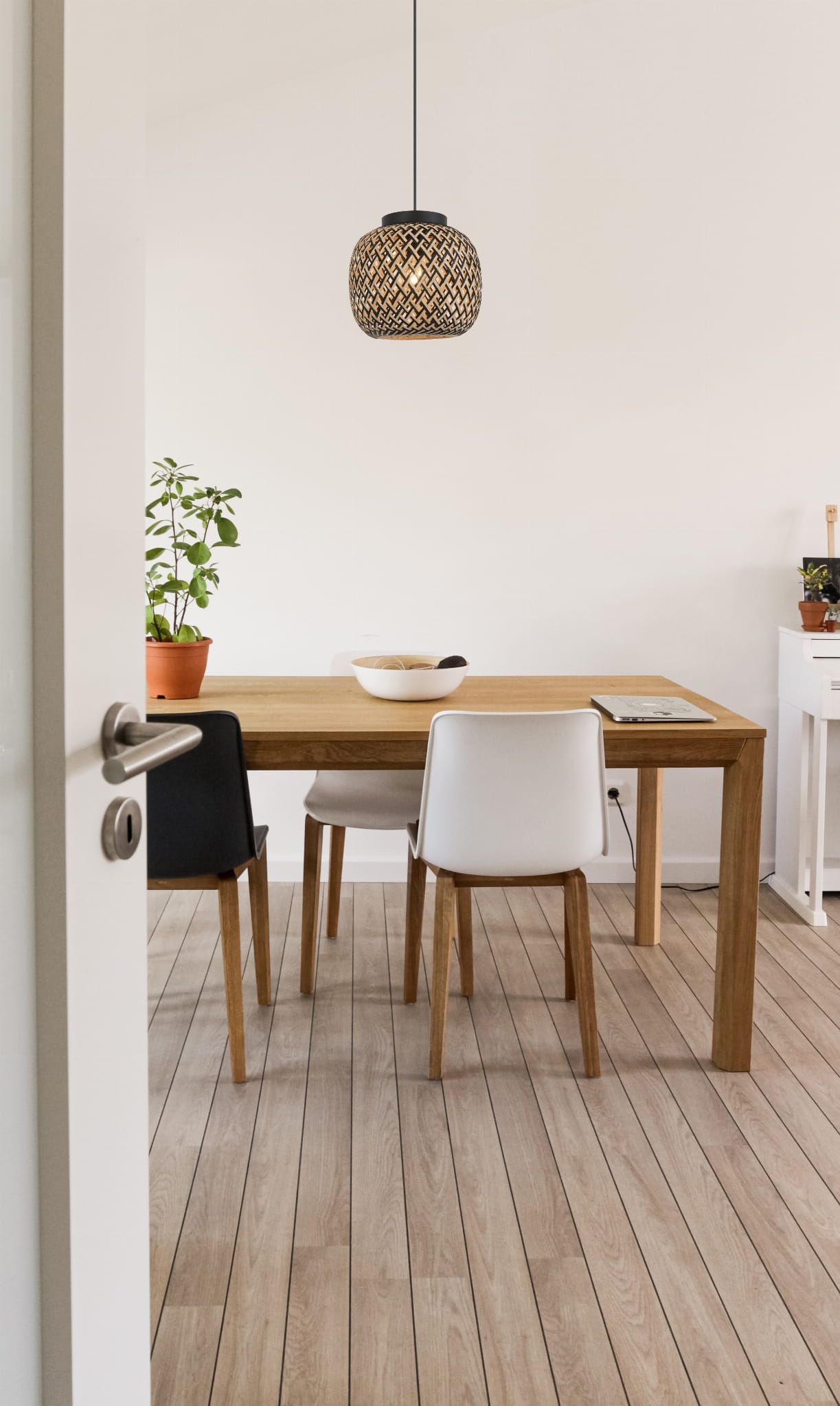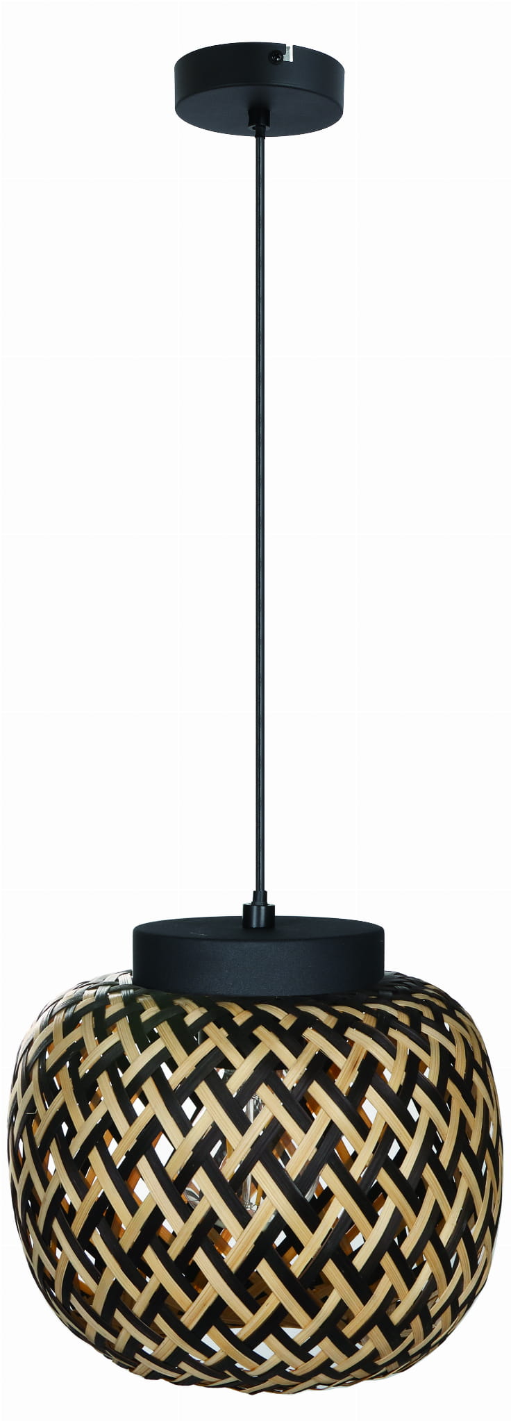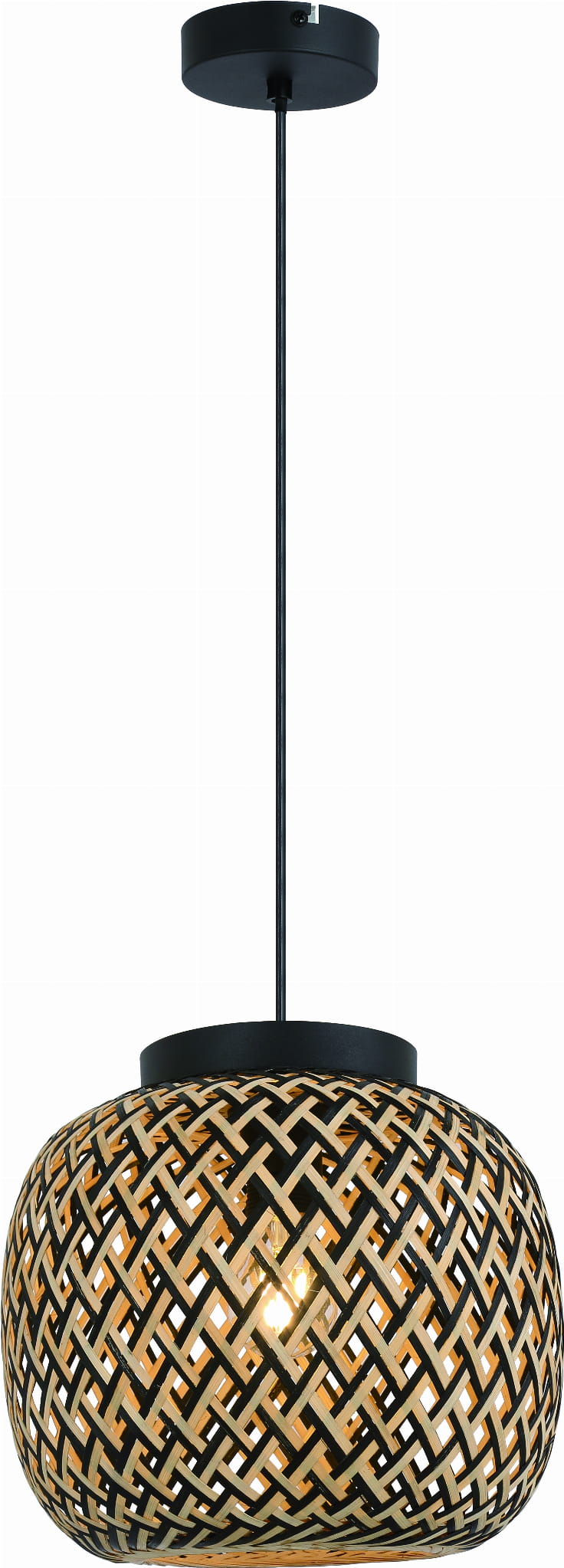 Elaine - lampa wisząca czarny mat. 1xE27 40W. Wysokość 27cm. Wysokość całkowita 120cm. Szerokość 30cm. Głębokość 30cm. Abażur bambus jasny brąz/czarny