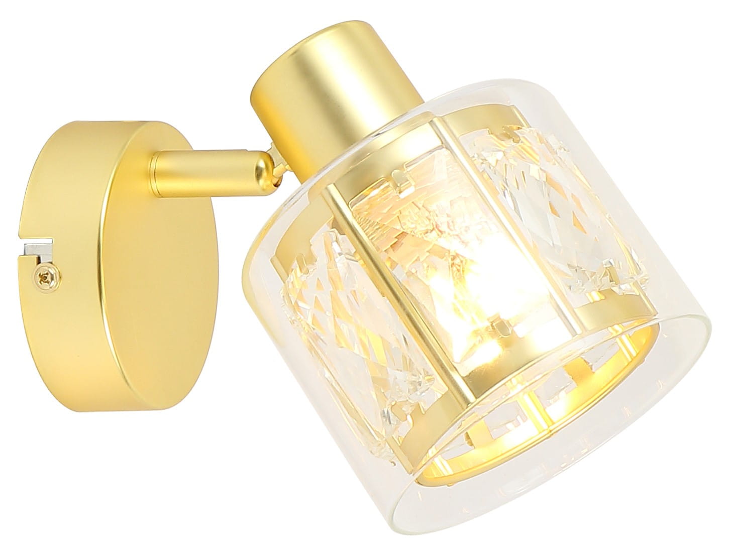 Elmo - kinkiet 1 płomienny jasne złoto. 1xE14 40W. Wysokość 13,5cm. Szerokość 12,5cm. Głębokość 10cm. Klosz: 1 metal/kryształ; 2 - przeroczysty