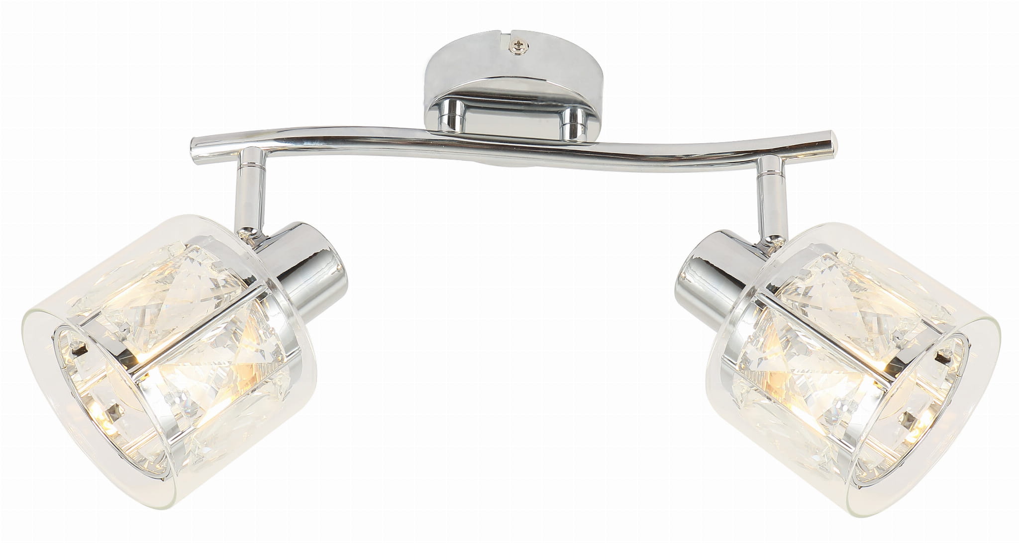 Elmo - kinkiet 2 płomienny chrom. 2xE14 40W. Wysokość 16cm. Szerokość 29cm. Głębokość 10cm. Klosze: 1 metal/kryształ; 2 - przeroczysty