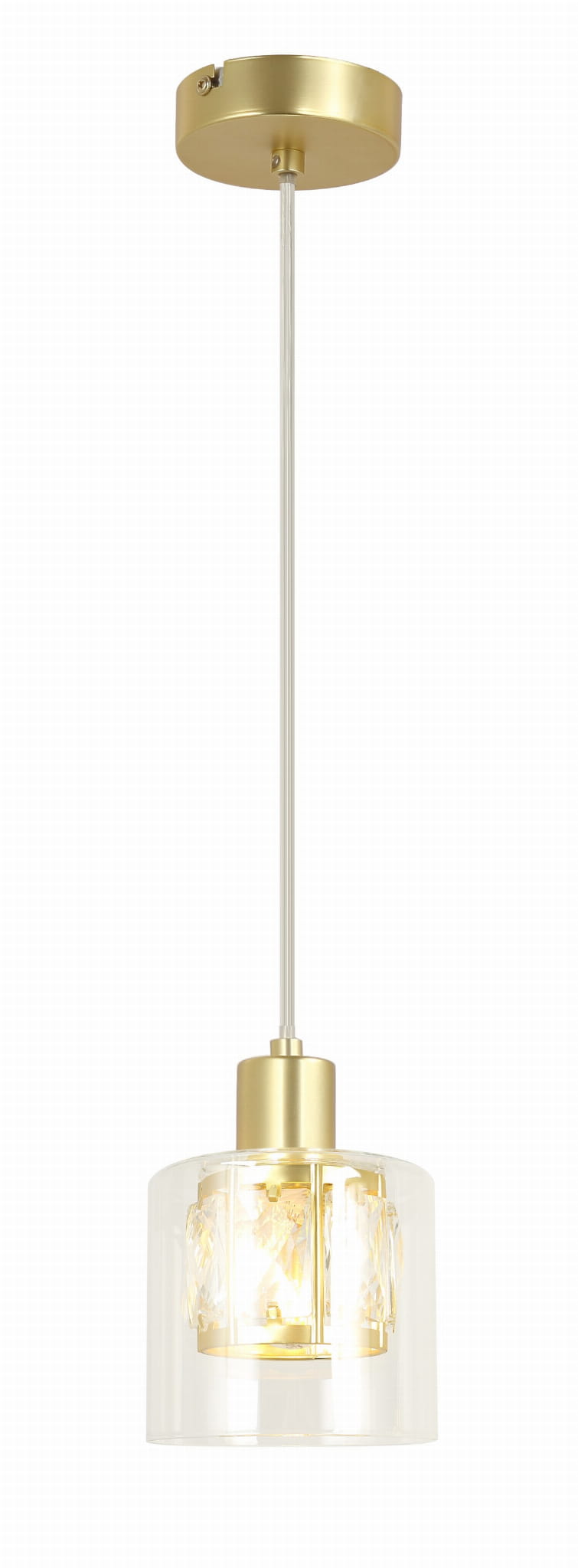 Elmo - lampa wisząca 1 płomienna złota. 1xE14 40W. Wysokość 15cm. Wysokość całkowita 120cm. Szerokość 12cm. Głębokość 12cm. Klosz: 1- metal/kryształ; 2- szkło przezroczyste