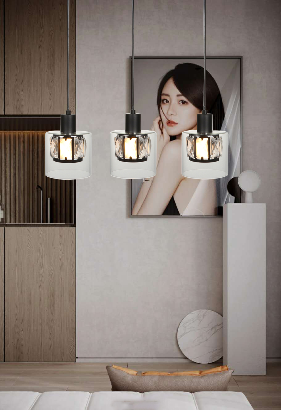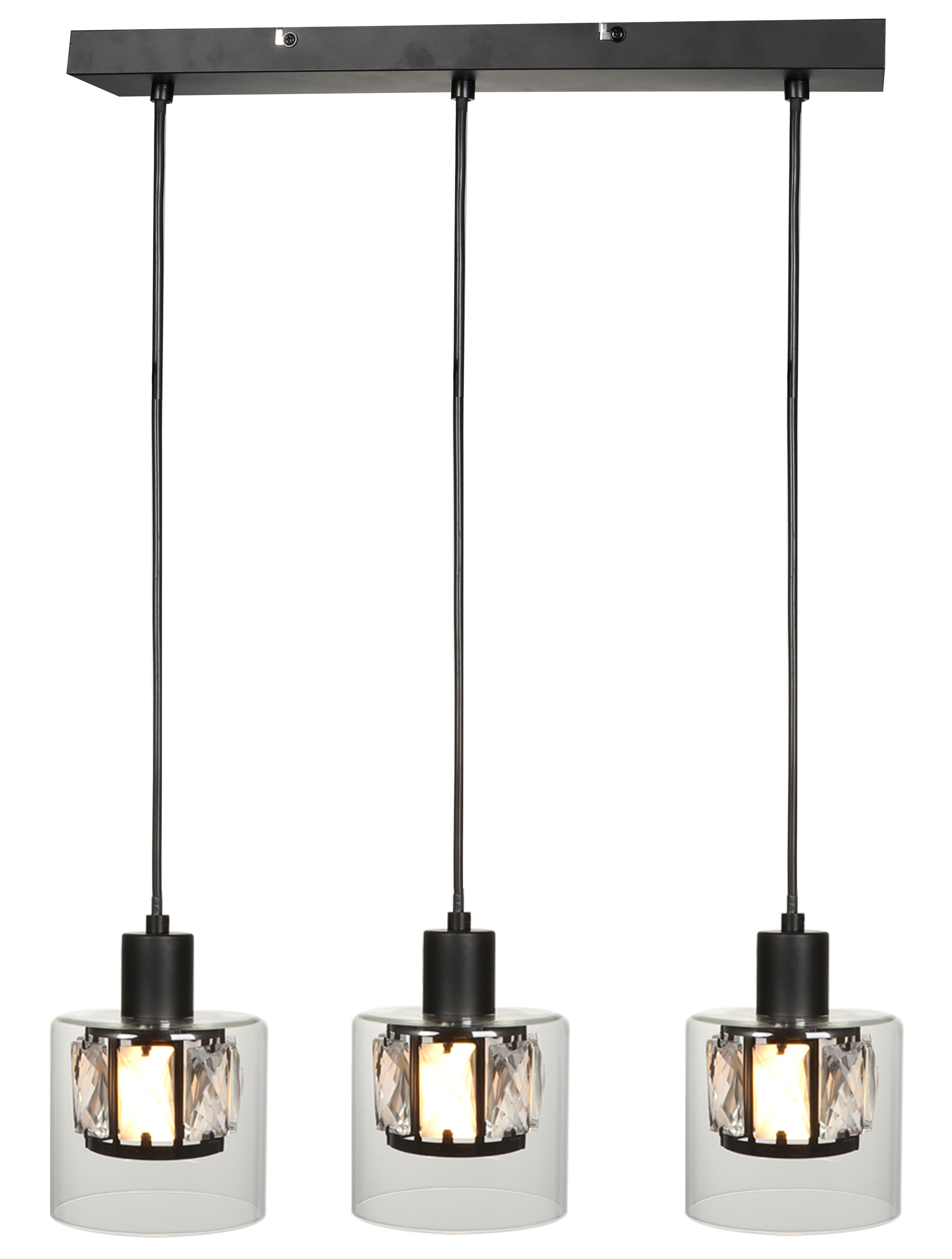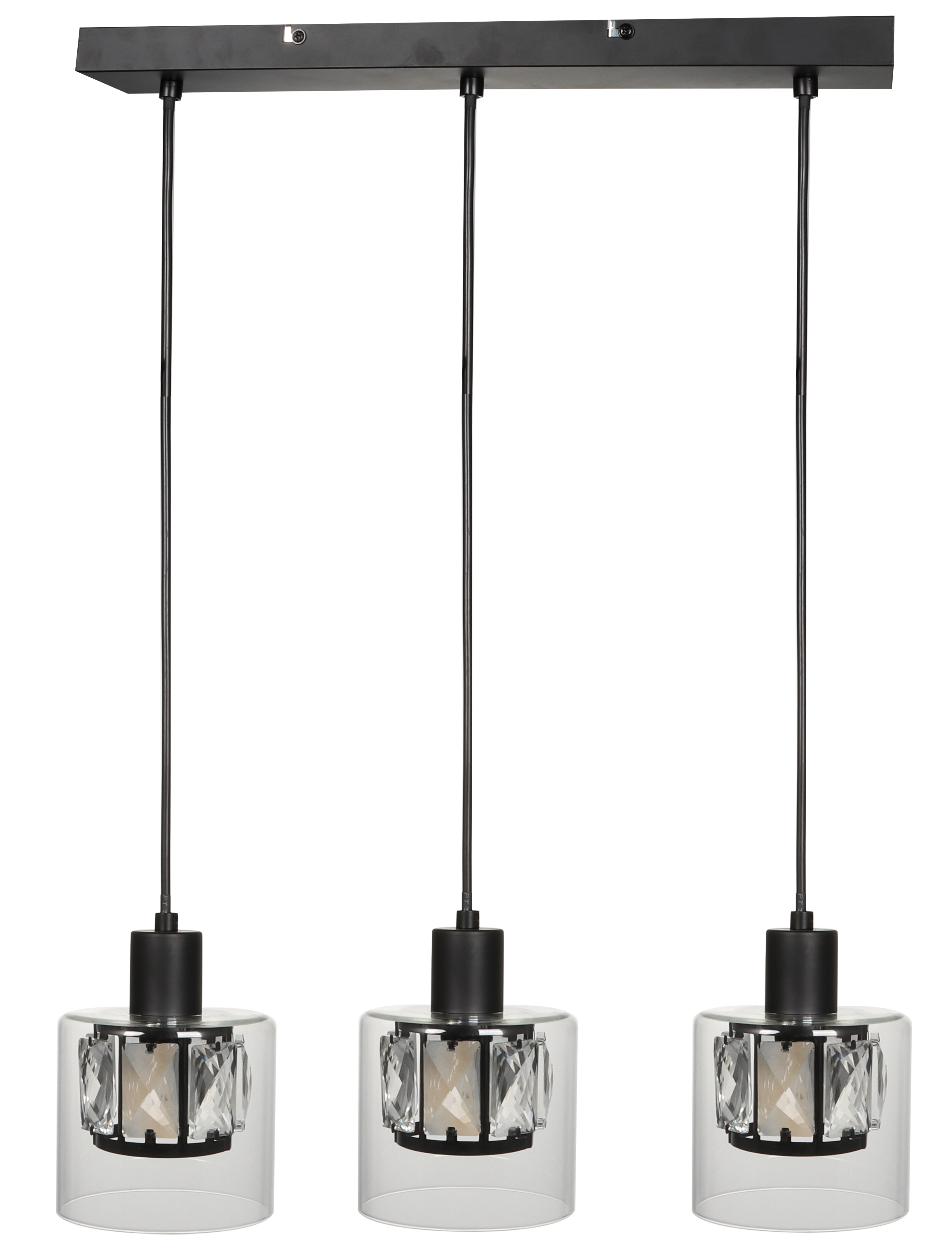 Elmo - lampa wisząca 3 płomienna czarny mat. 3xE14 40W. Wysokość 15cm. Wysokość całkowita 120cm. Szerokość 47cm. Głębokość 12cm. Klosz: 1- metal/kryształ; 2- szkło przezroczyste