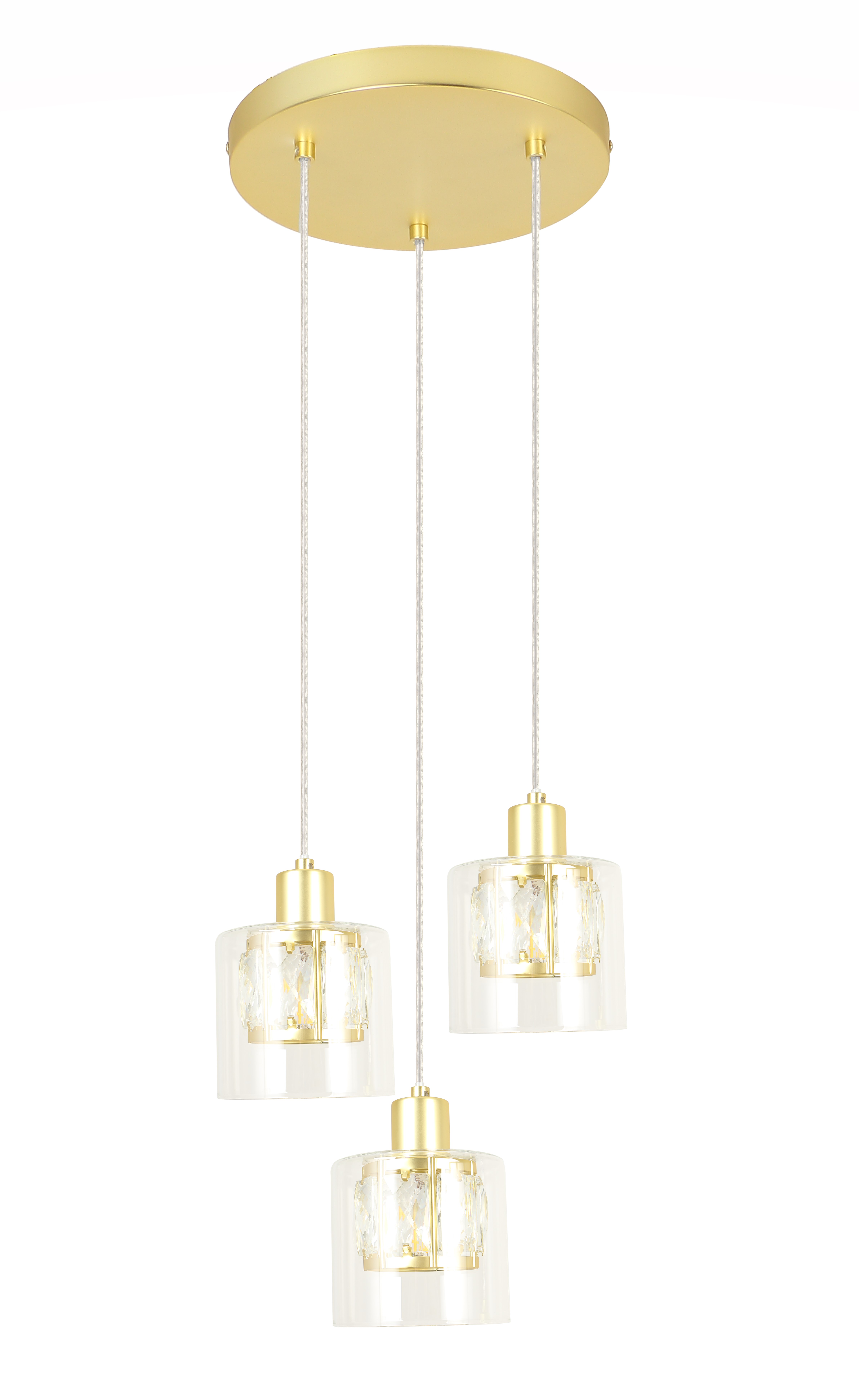 Elmo - lampa wisząca 3 płomienna złota. 3xE14 40W. Wysokość 15cm. Wysokość całkowita 120cm. Szerokość 25cm. Głębokość 25cm. Klosz: 1- metal/kryształ; 2- szkło