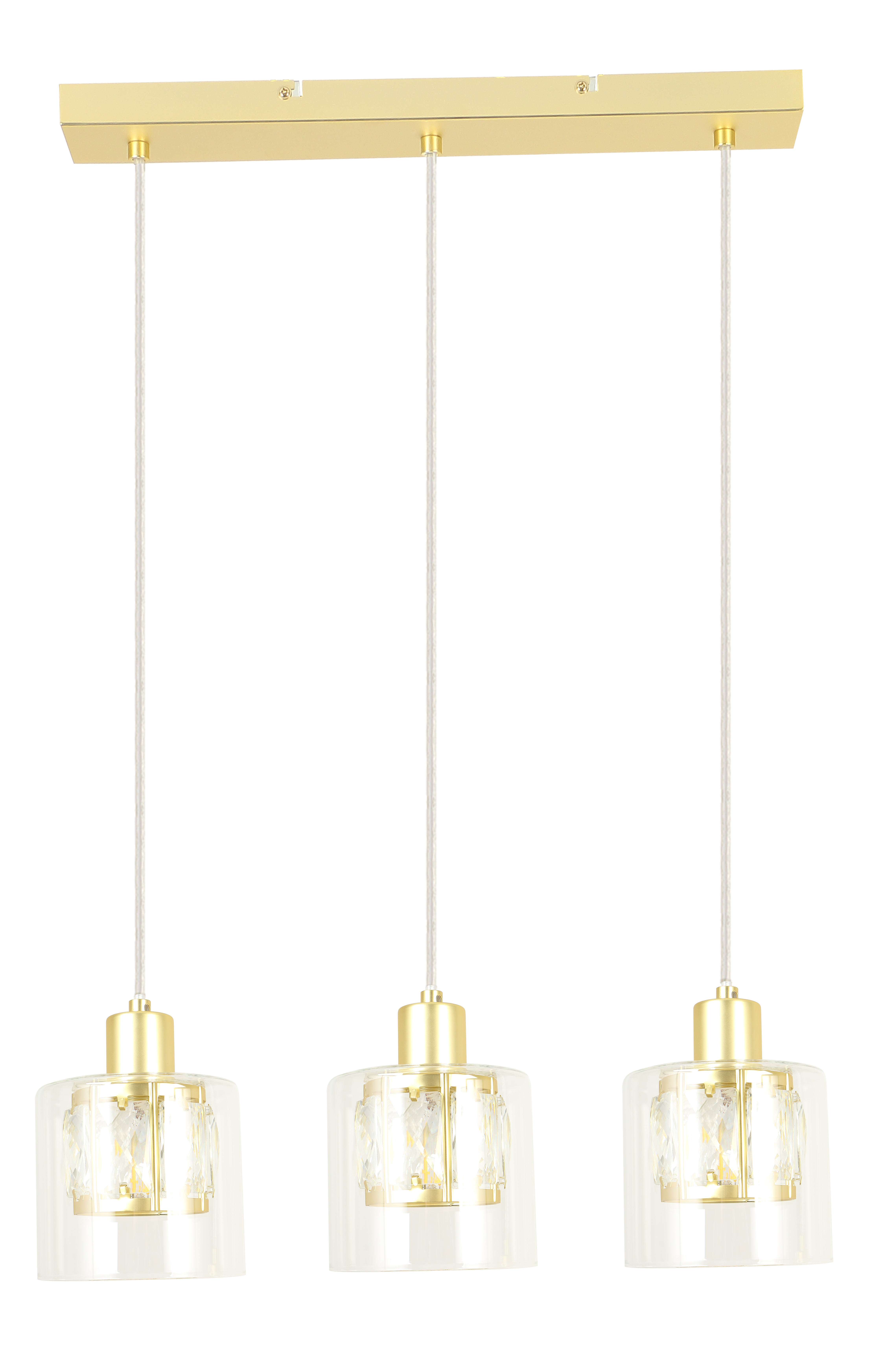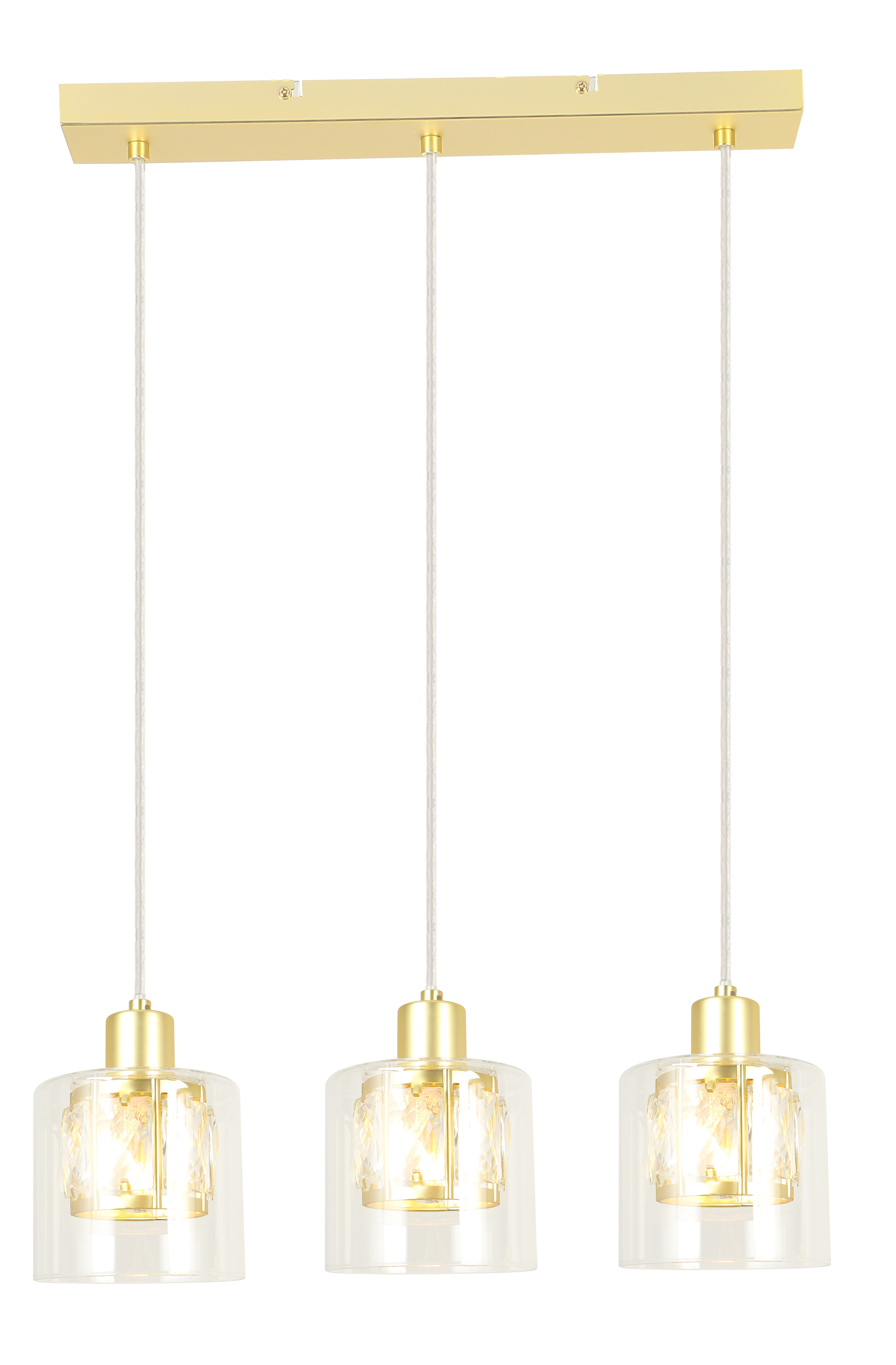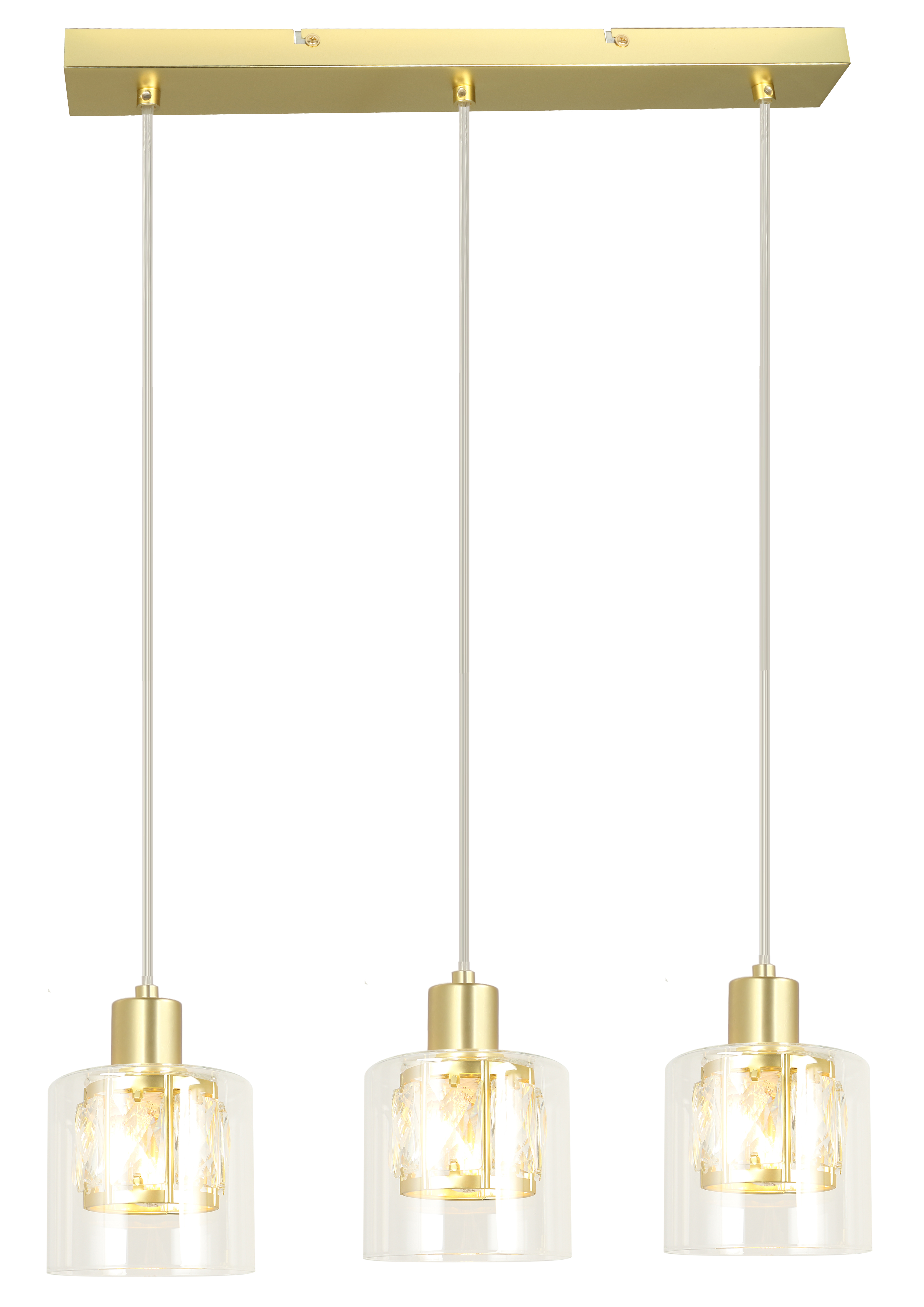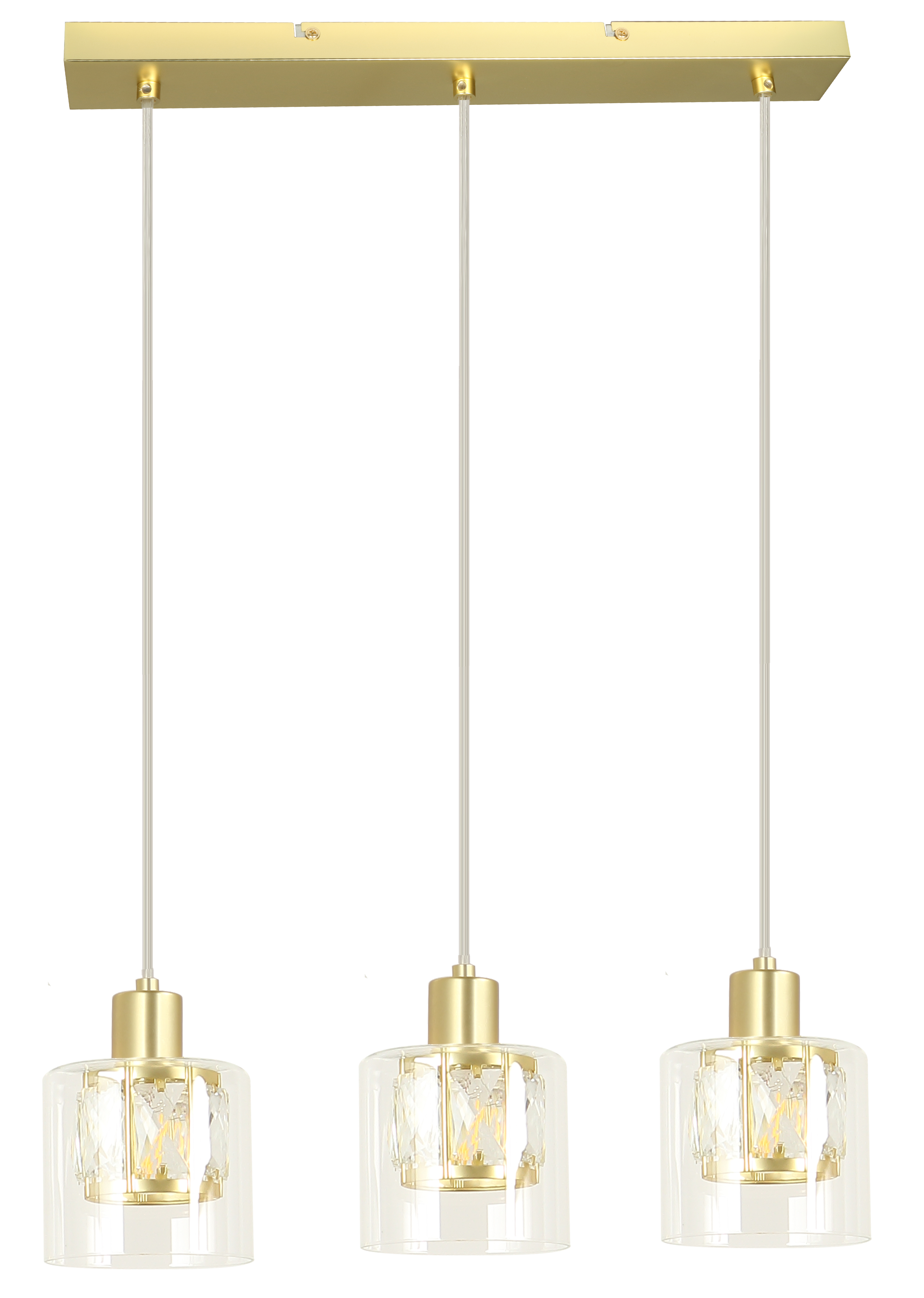 Elmo - lampa wisząca 3 płomiennajasny złoty. 3xE14 40W. Wysokość 15cm. Wysokość całkowita 120cm. Szerokość 47cm. Głębokość 12cm. Klosz: 1- metal/kryształ; 2- szkło przezroczyste
