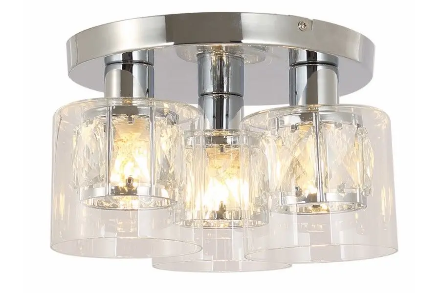 Elmo - plafon 3 płomienny chrom. 3xE14 40W. Wysokość 17,5cm. Szerokość 25cm. Głębokość 25cm. Klosze: 1- metal/kryształ; 2- szkło przezroczyste