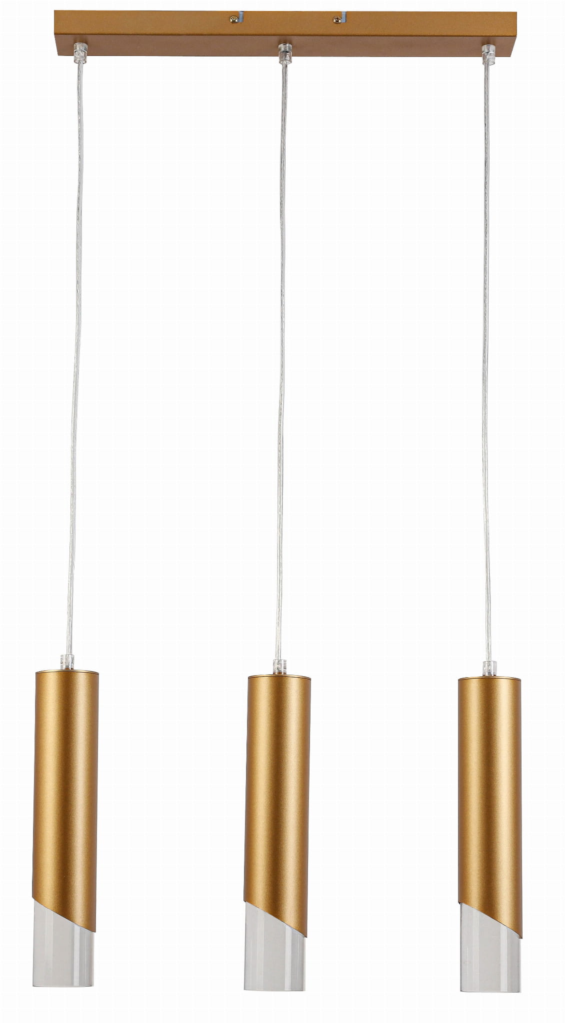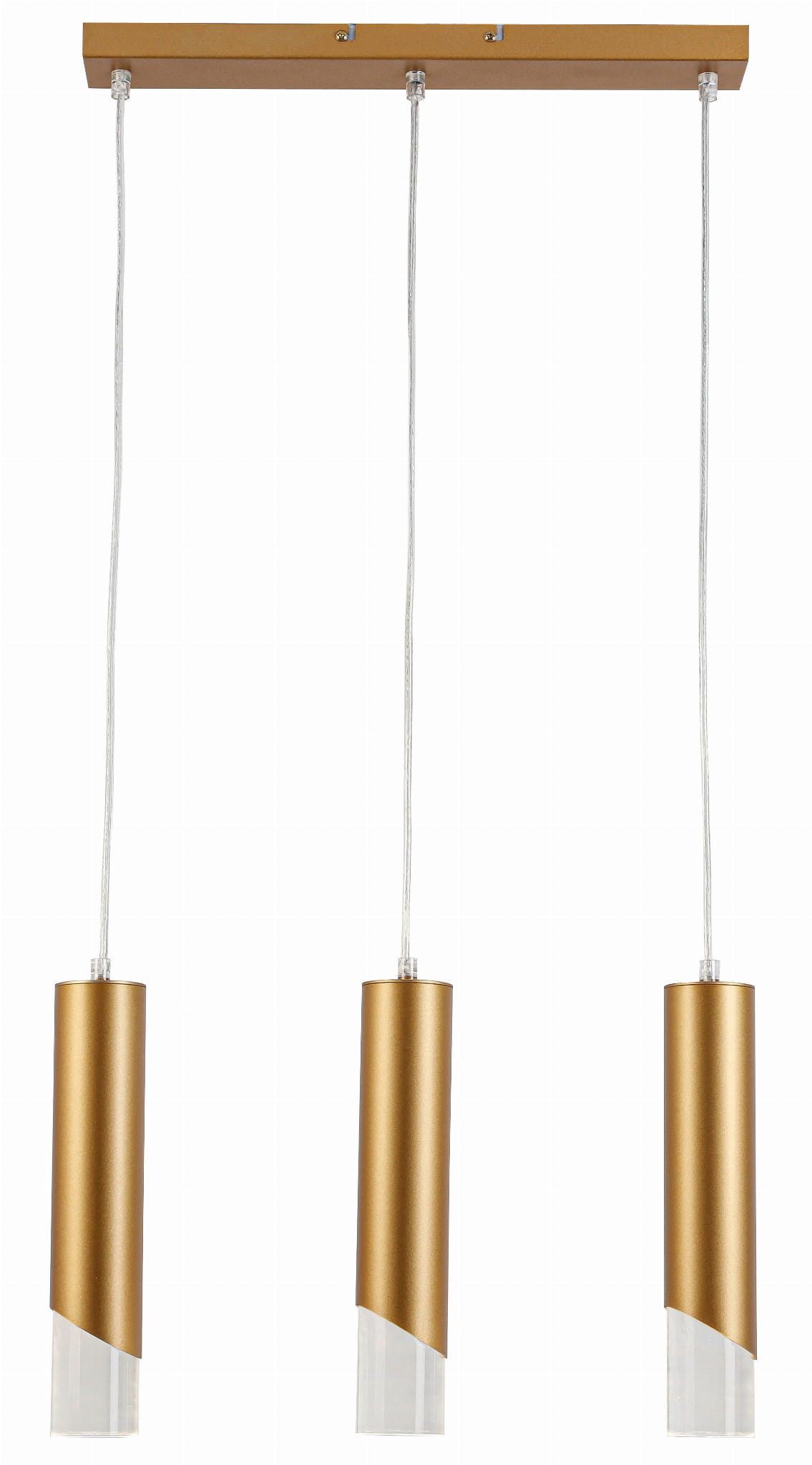 Hardin - lampa wisząca 3 płomienna złoty malowany. 3xE27 40W. Wysokość 29cm. Wysokość całkowita 120cm. Szerokość 45cm. Głębokość 6cm. Klosze akryl