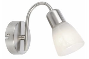 Gordon - kinkiet 1 płomienny nikiel mat. 1xE14 40W. Wysokość 16cm. Szerokość 22cm. Głębokość 10cm. Klosz szklany biały alabaster.