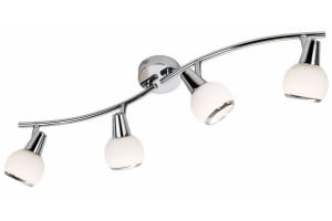 Loris - listwa 4 płomienna chrom. 4xE14 40W. Wysokość 14cm. Szerokość 70cm. Głębokość 12cm. Klosze białe opal mat z chromowanymi obręczami.