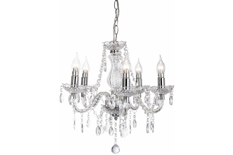 Marie - zwis 5 płomienny chrom/przezroczysty. 5xE14 max 40W. Wysokość 48cm. Wysokość całkowita 120cm. Szerokość 48cm. Głębokość 48cm. Ozdoby akrylowe.