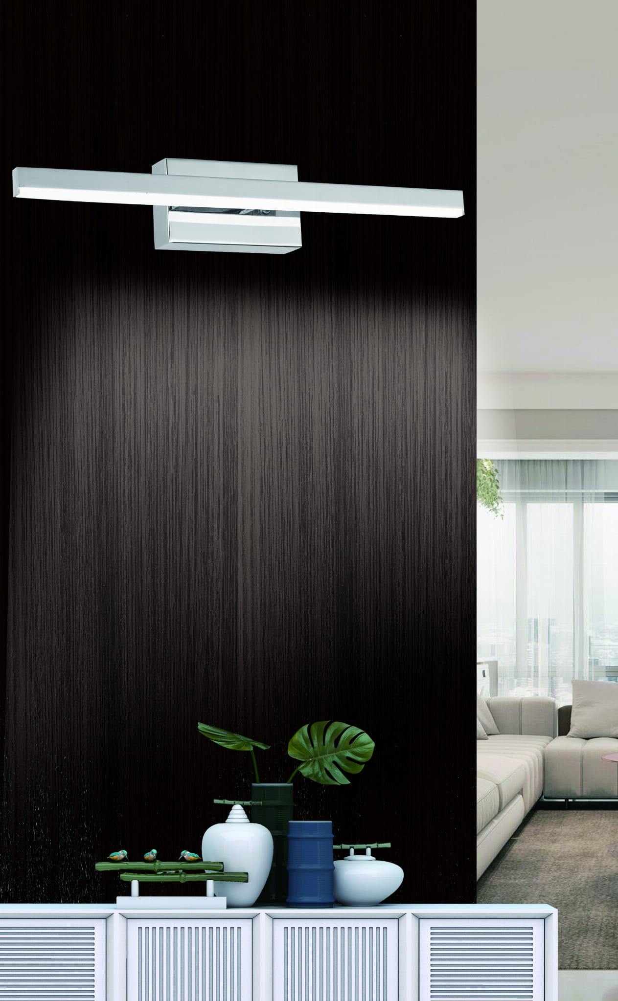 Linea - kinkiet łazienkowy LED chrom. 1x5W 350Lm 4000K. Wysokość 7cm. Szerokość 40cm. Głębokość 8cm. IP44. Klosz akryl. 5 lat gwarancji.