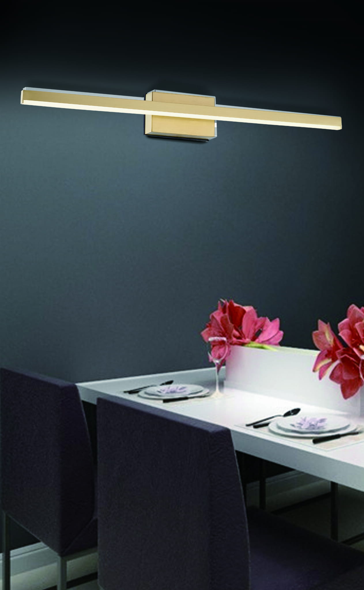 Linea - kinkiet łazienkowy LED jasny złoty. 1x8W 640Lm 4000K. Wysokość 7cm. Szerokość 60cm. Głębokość 8cm. IP44. Klosz akryl. 5 lat gwarancji.