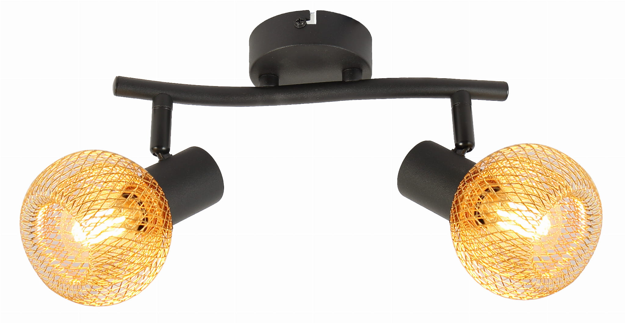 Loretto - listwa 2 płomienna czarna. 2xE14 40W. Wysokość 17cm. Szerokość 26cm. Głębokość 10cm. Klosze podwójne z metalowej siatki złote