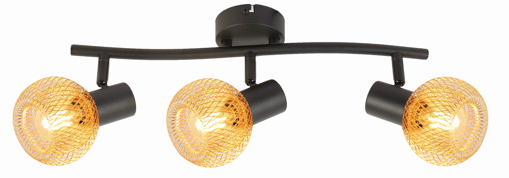 Loretto - listwa 3 płomienna czarna. 3xE14 40W. Wysokość 17cm. Szerokość 45cm. Głębokość 10cm. Klosze podwójne z metalowej siatki złote