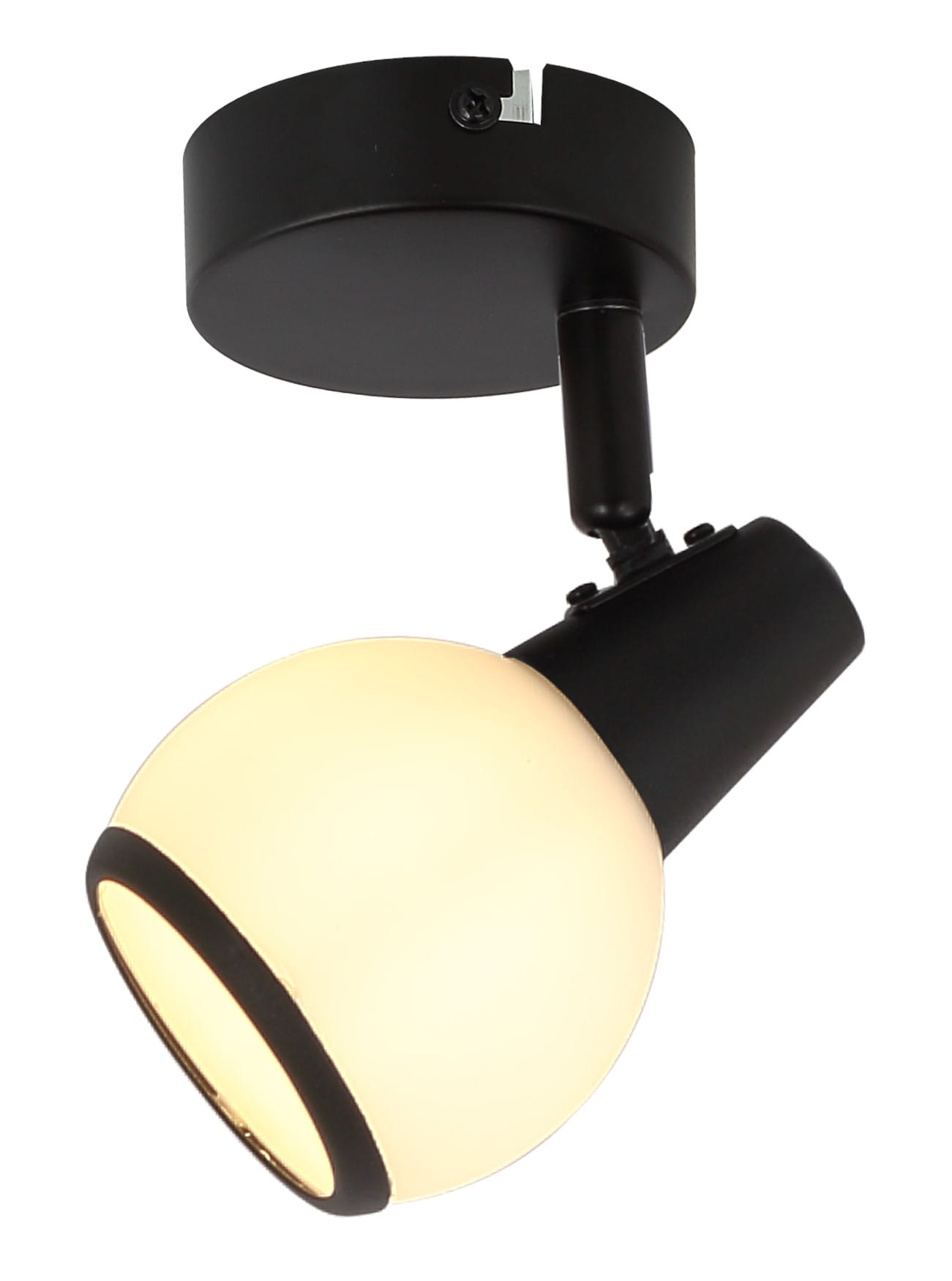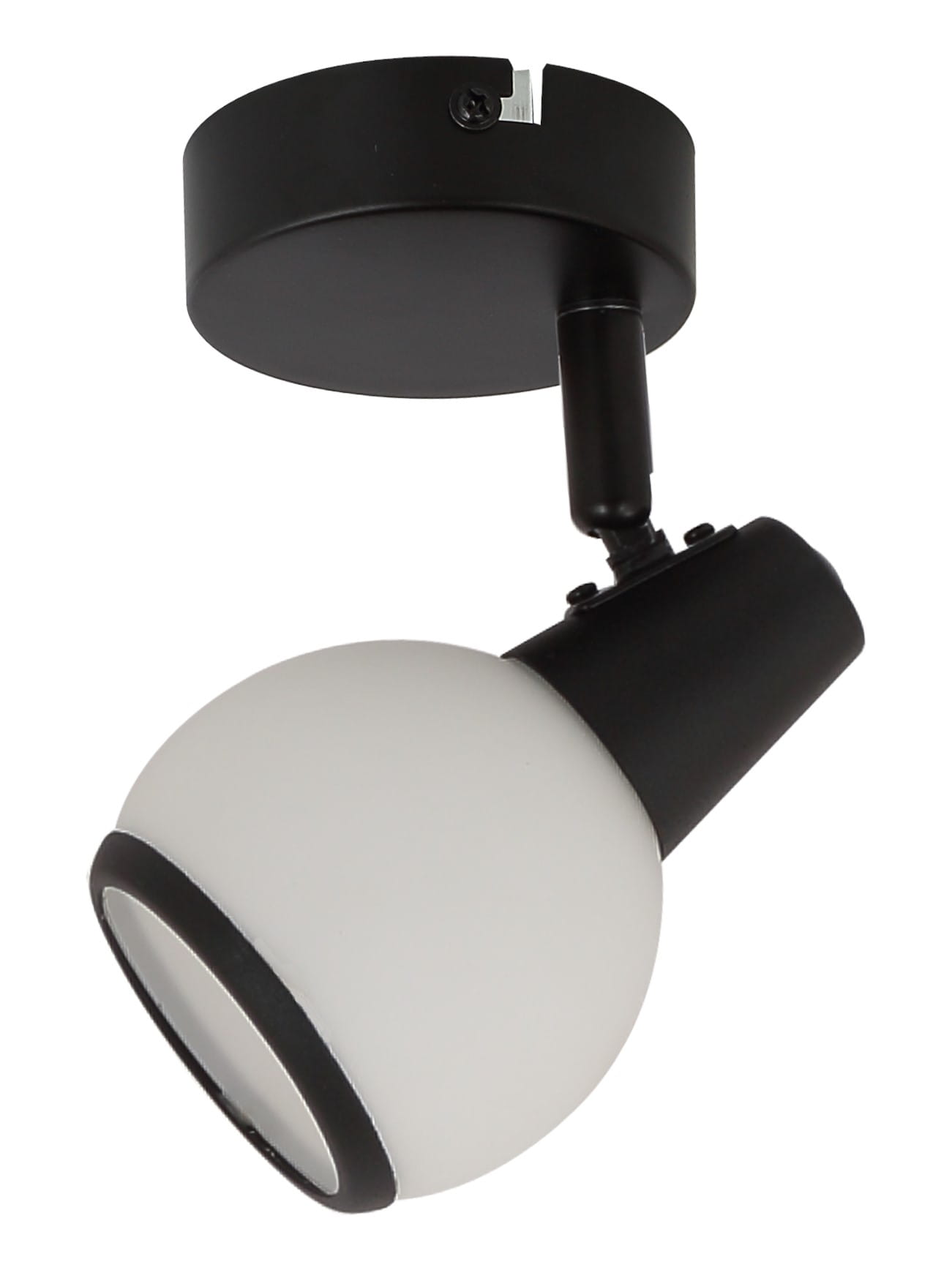 Loris - kinkiet 1 płomienny czarny mat. 1xE14 40W. Wysokość 12cm. Szerokość 8cm. Głębokość 14cm. Klosz biały opal mat z czarny matowaną obręczą.