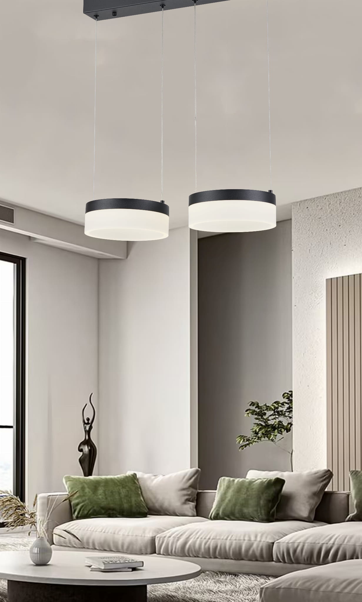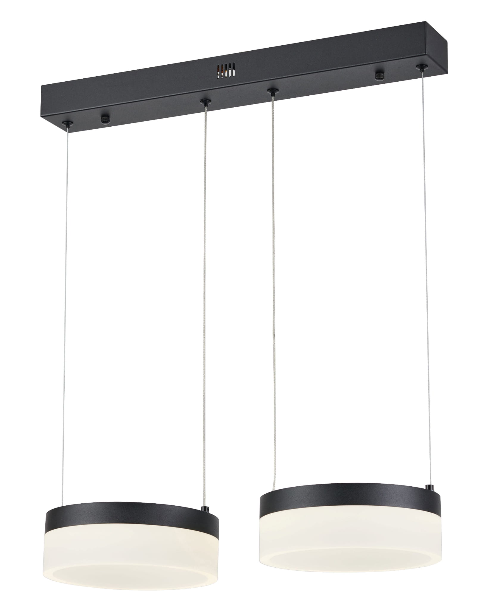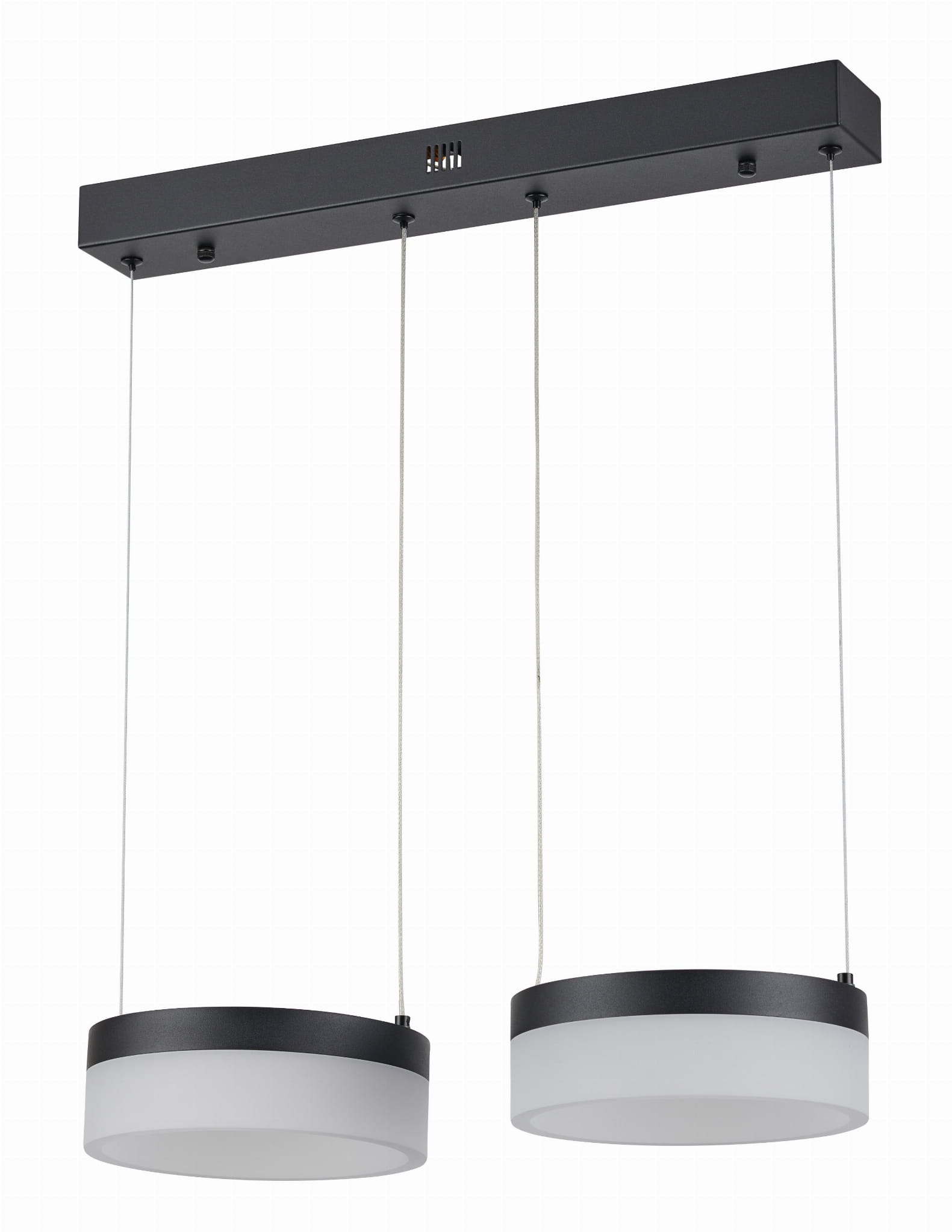 Nicki - lampa wisząca 2 płomienna LED czarna. 2x12W 2x960Lm 4000K. Wysokość 7cm. Wysokość całkowita 100cm. Szerokość 50cm. Głębokość 20cm. Klosze akryl mat