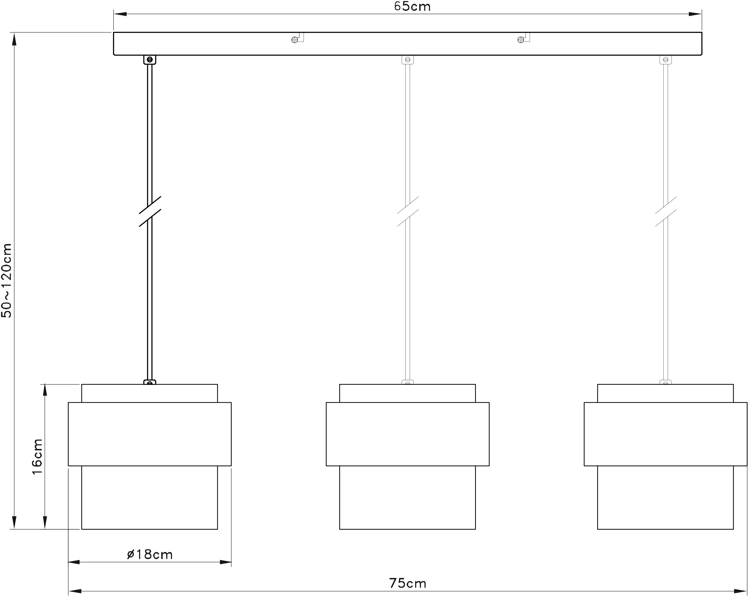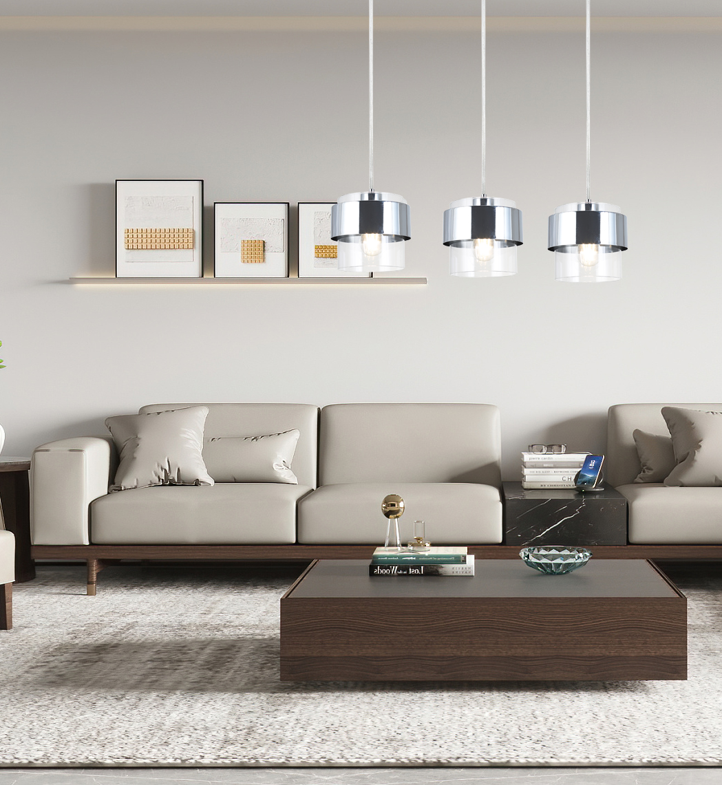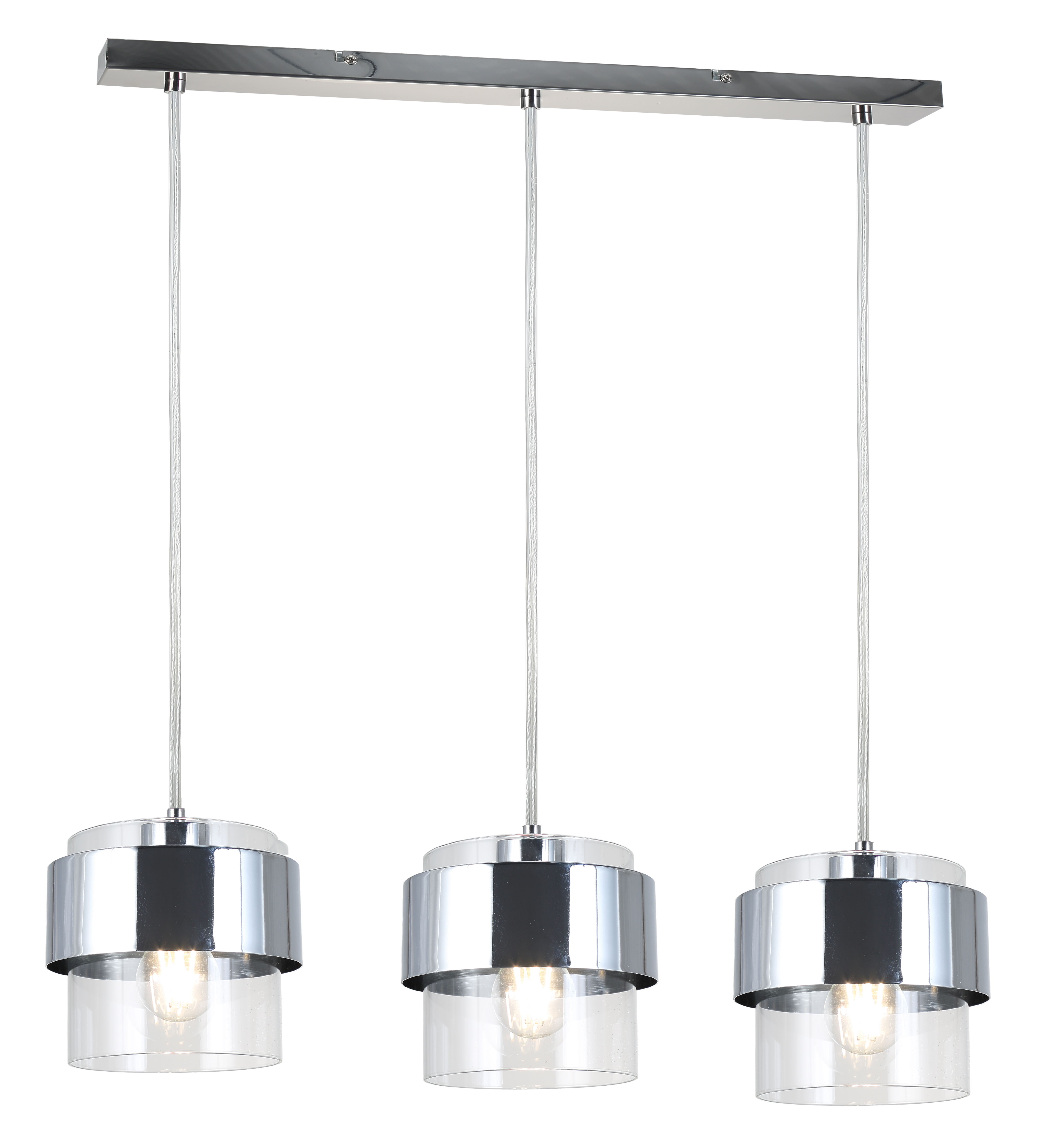 Quan - lampa wisząca 3 płomienna chrom. 3xE27 40W. Wysokość 16cm. Wysokość całkowita 120cm. Szerokość 75cm. Głębokość 18cm. Klosz: 1- metal, 2- szkło przezroczyste