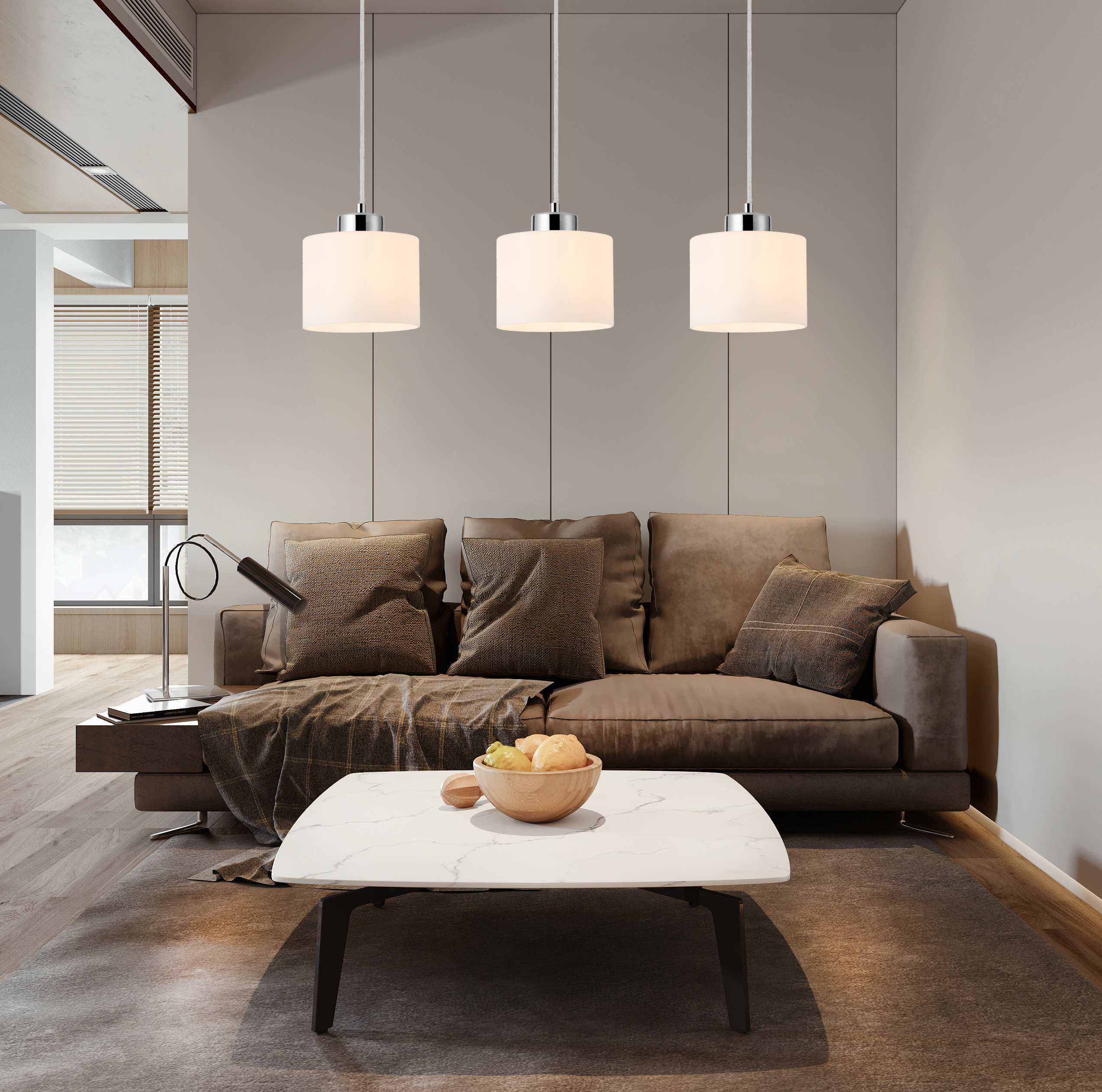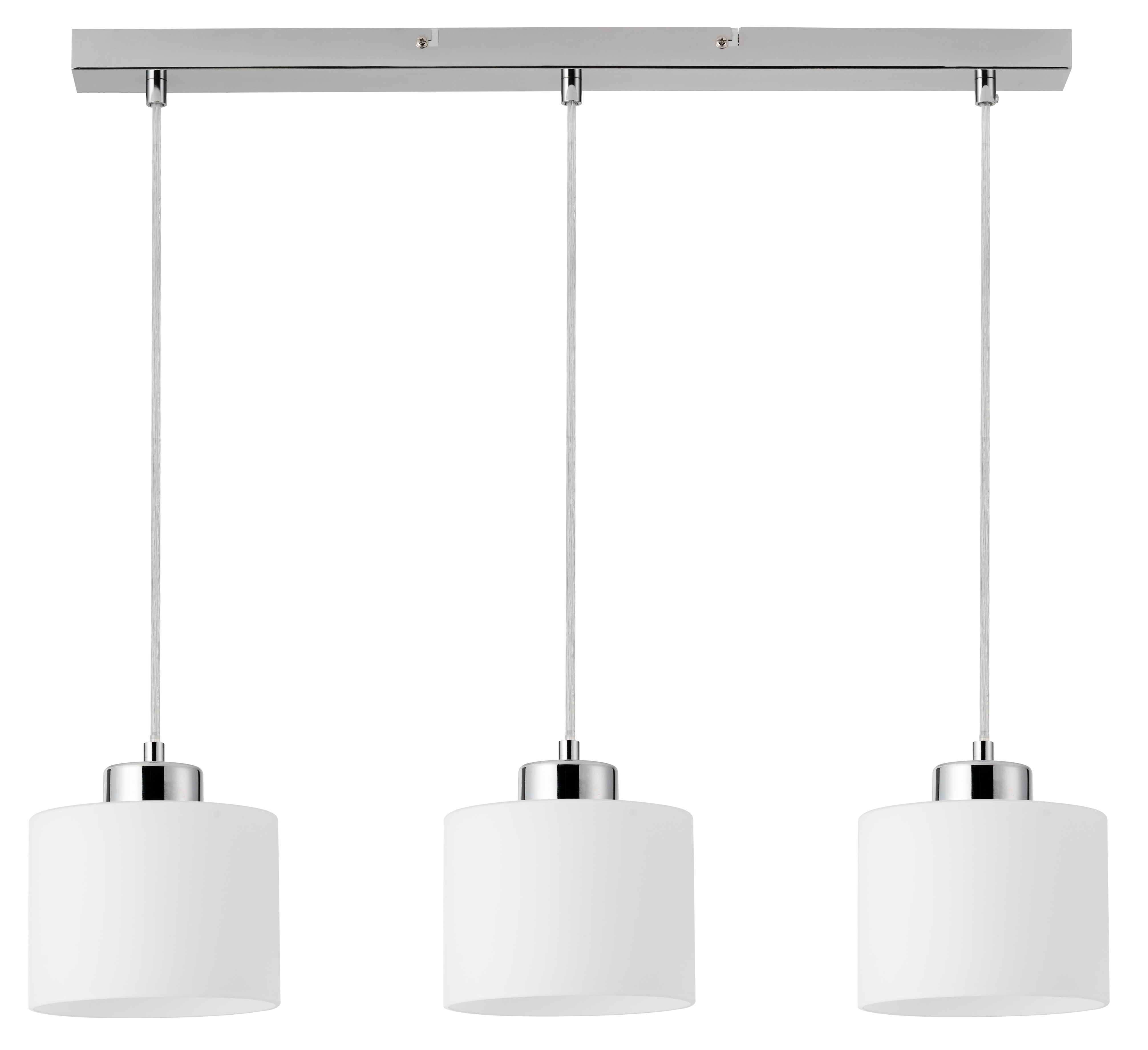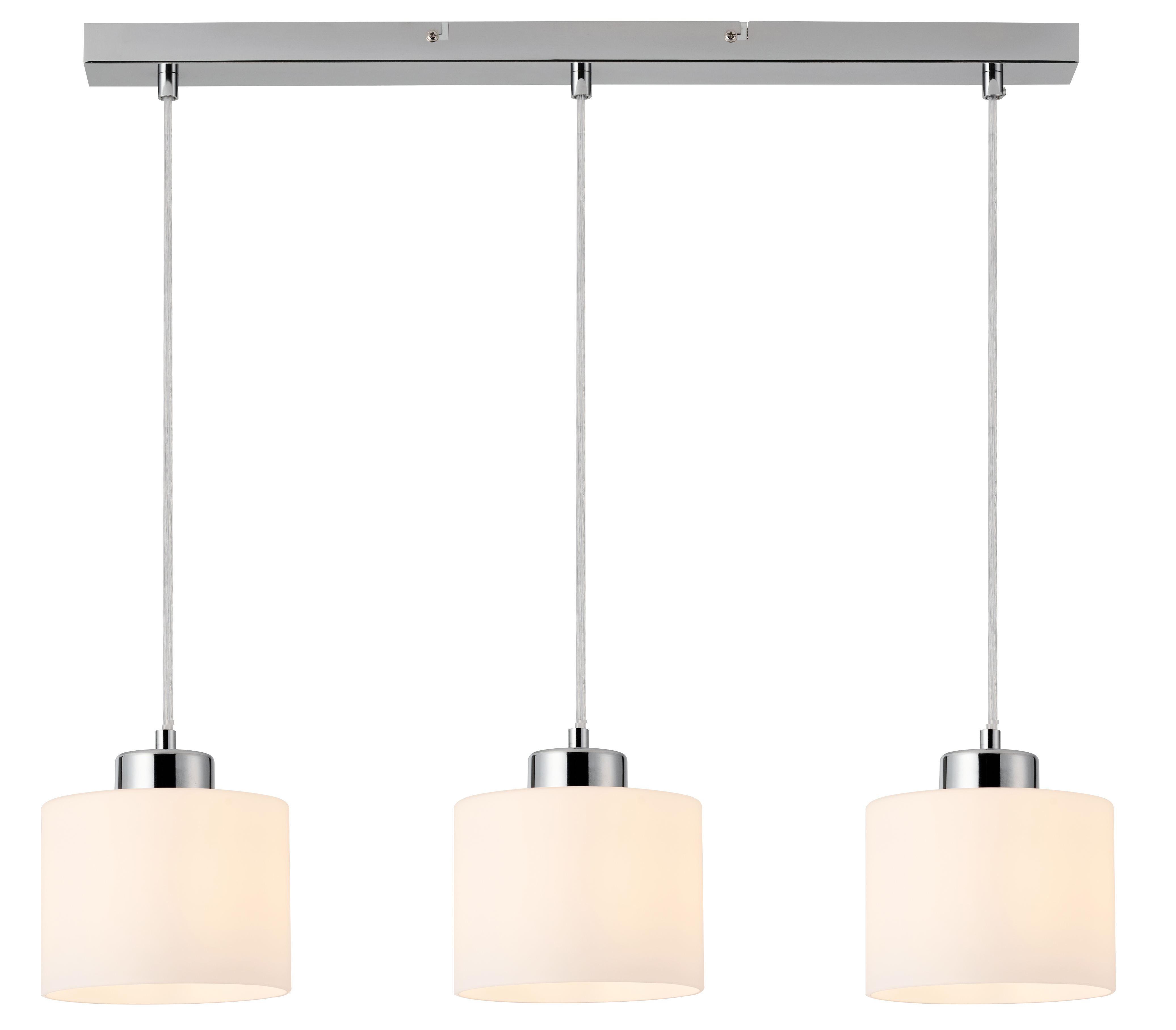 Riva - lampa wisząca chrom. 3xE27 40W. Wysokość 11cm. Wysokość całkowita 120cm. Szerokość 60cm. Głębokość 15cm. Klosze szklany biały opal mat.