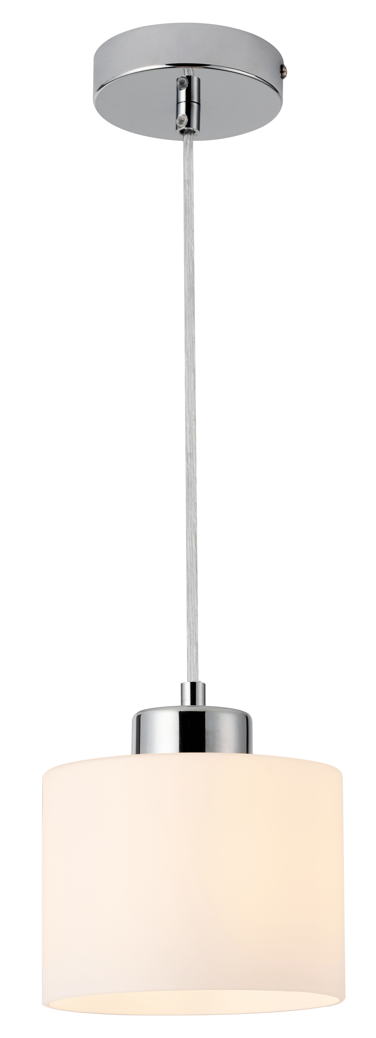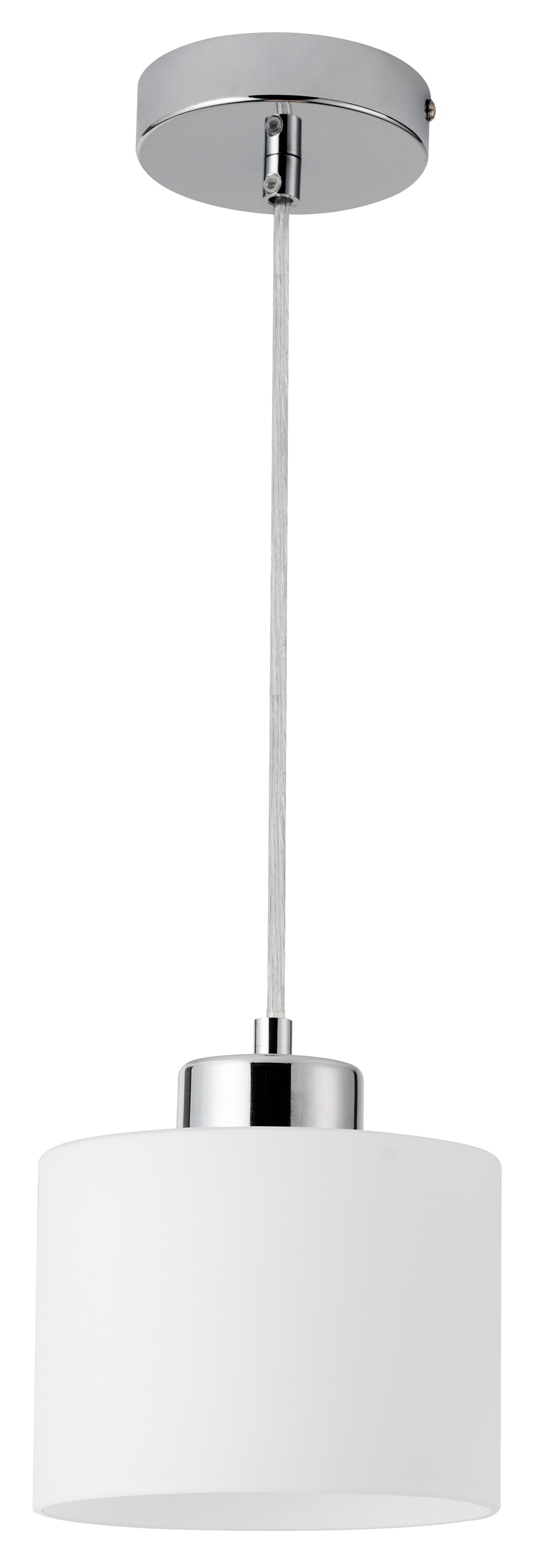 Riva - lampa wisząca chrom. 1xE27 40W. Wysokość 11cm. Wysokość całkowita 120cm. Szerokość 15cm. Głębokość 15cm. Klosz szklany biały opal mat.