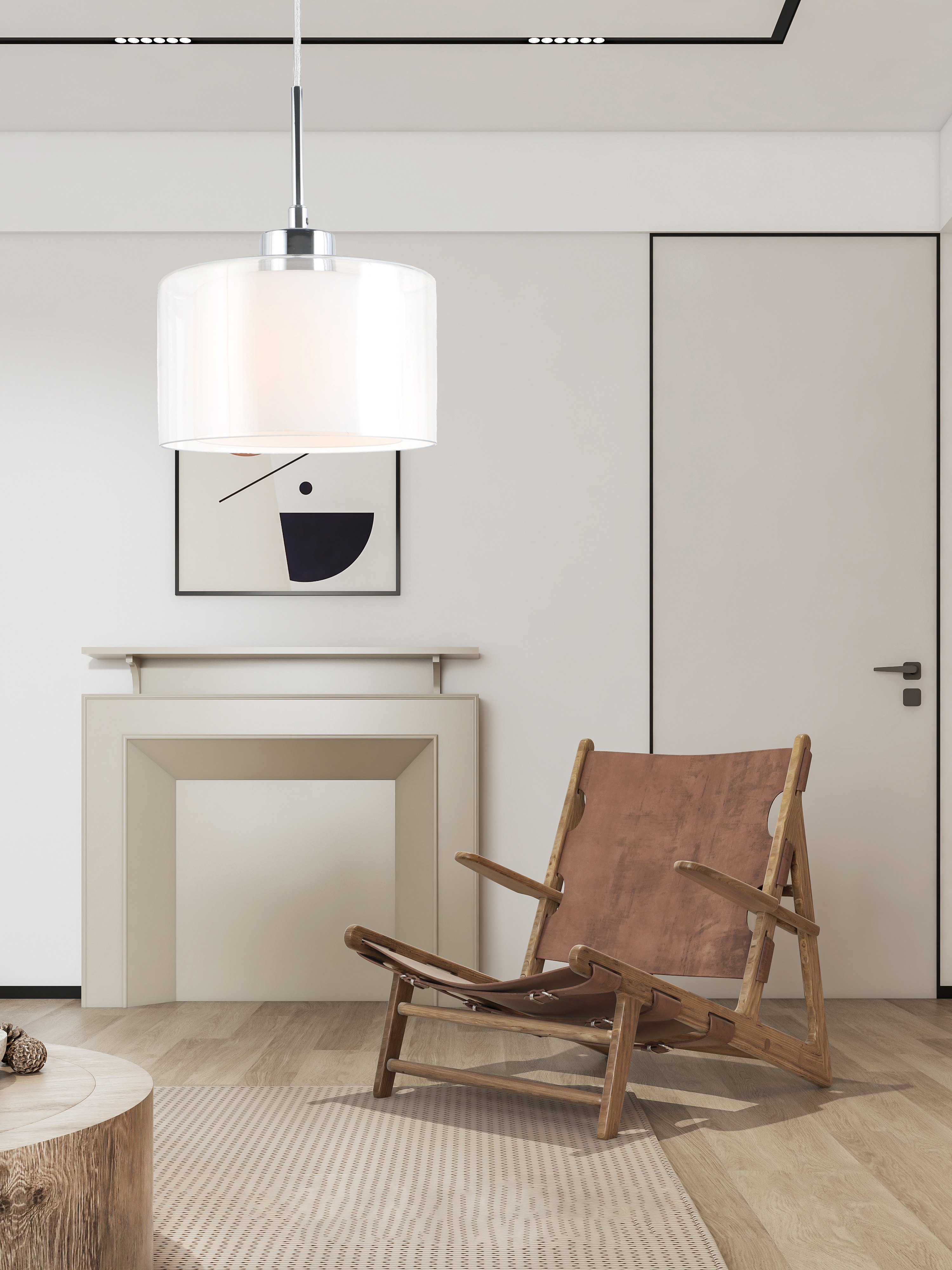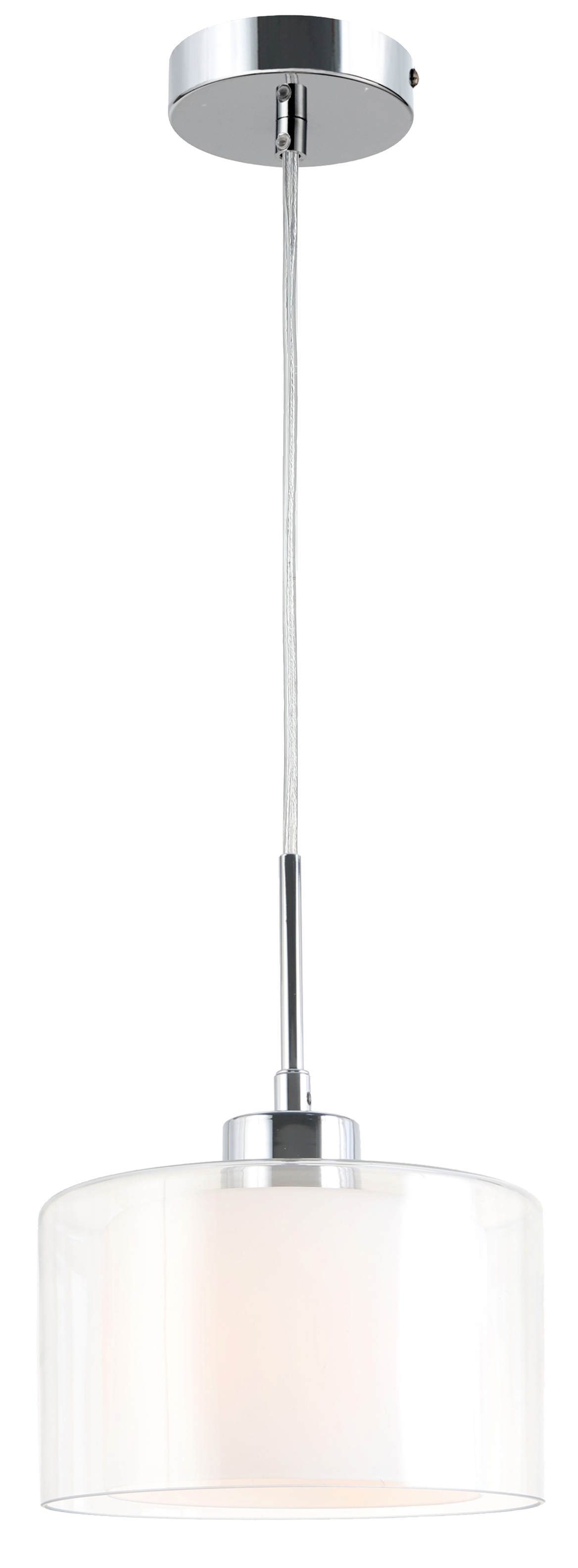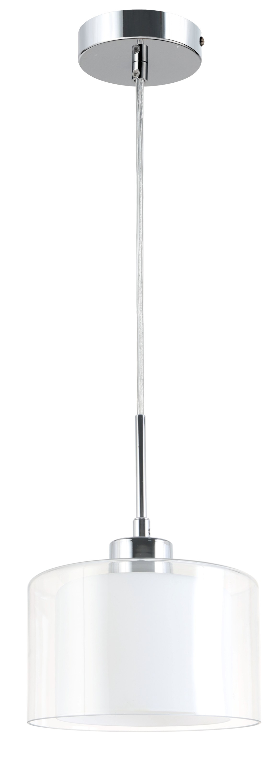 Soren - lampa wisząca 1 płomienna chrom. 1xE27 40W. Wysokość 12cm. Wysokość całkowita 120cm. Szerokość 20cm. Głębokość 20cm. Klosz biały opal mat i przezroczysty