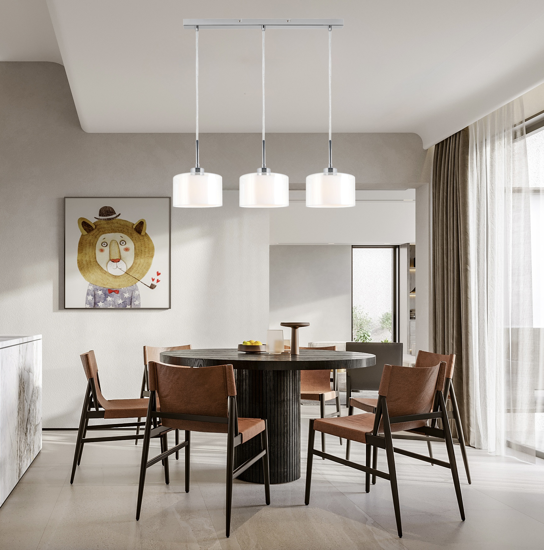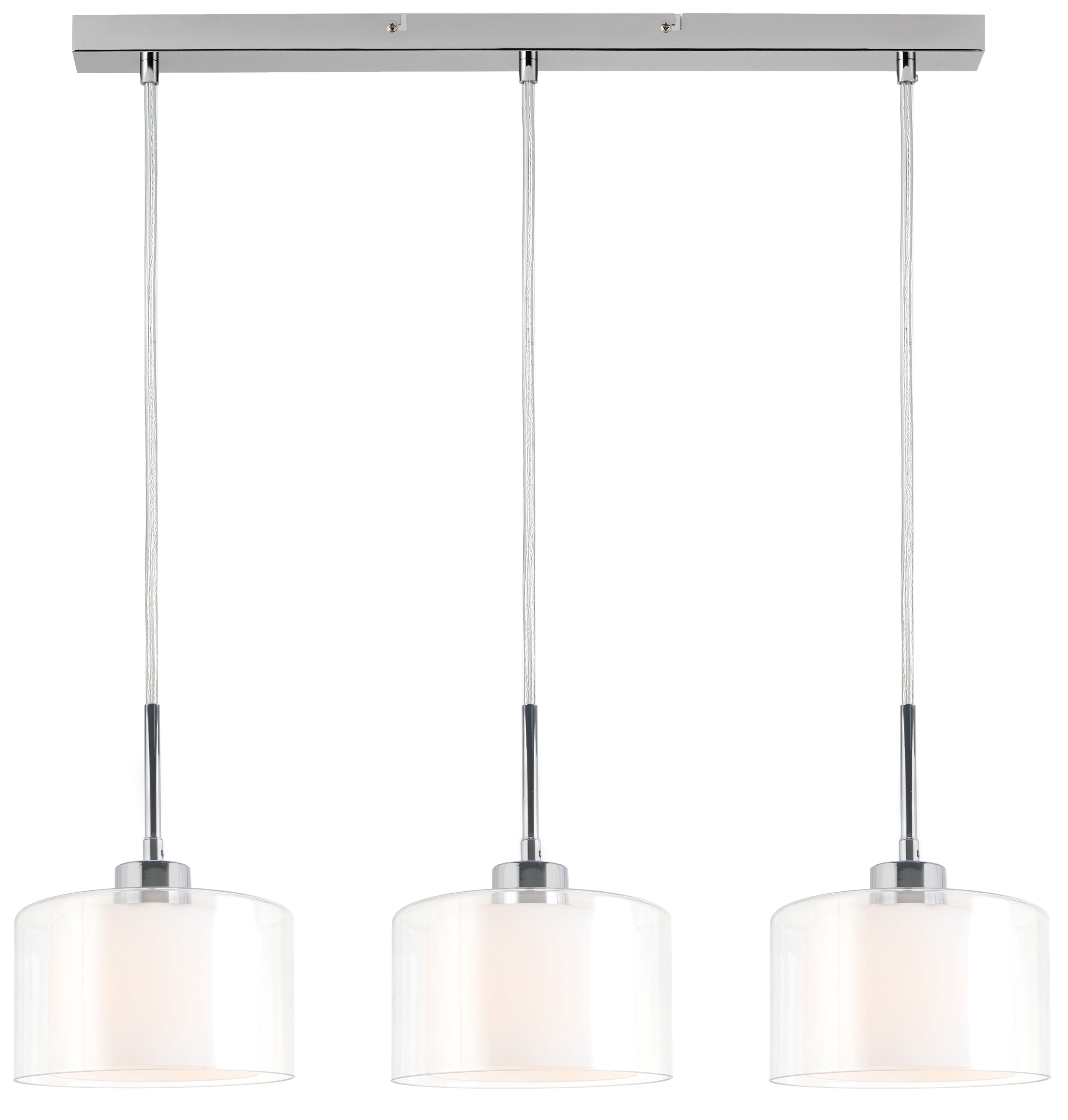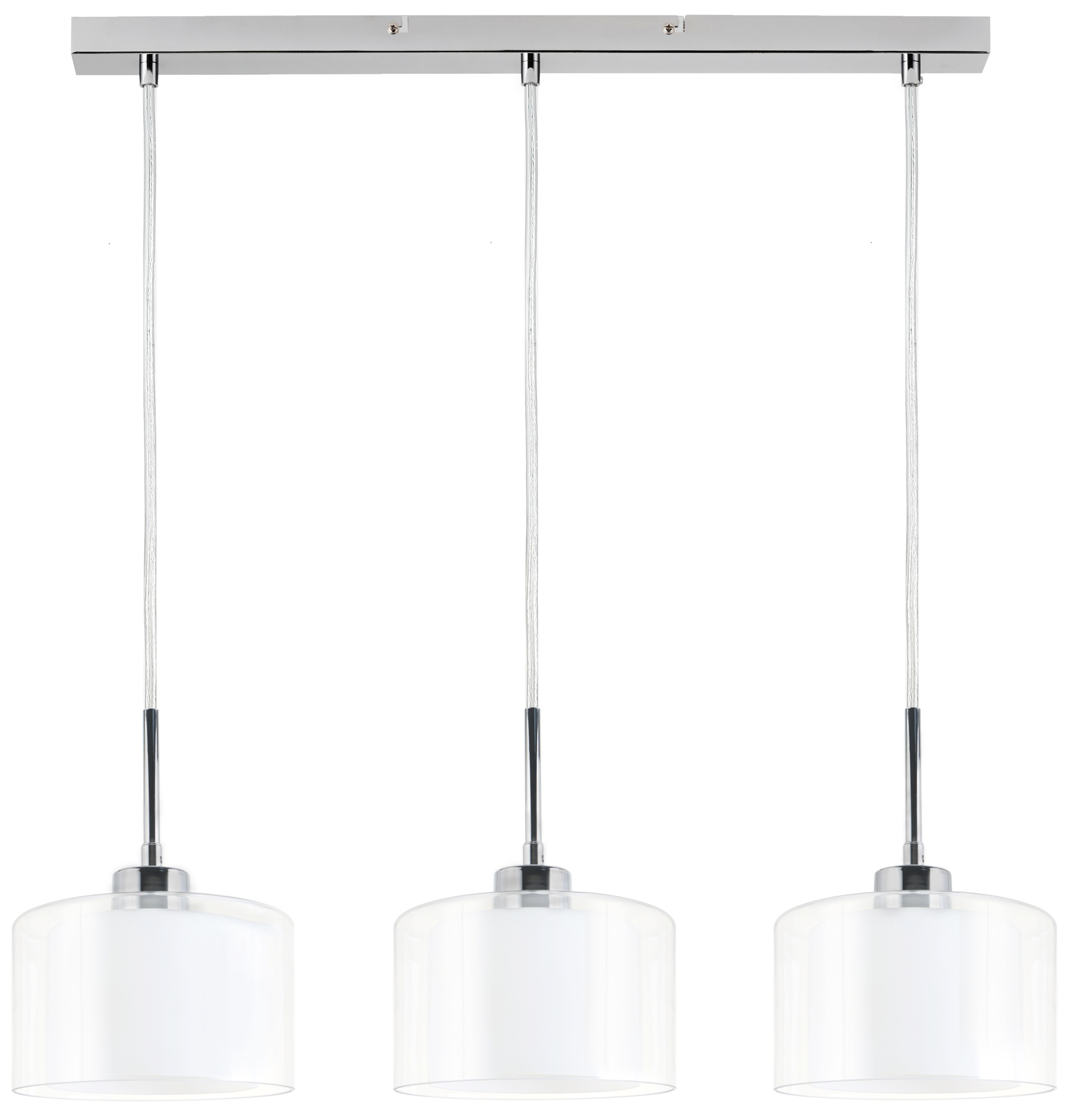 Soren - lampa wisząca 3 płomienna chrom. 3xE27 40W. Wysokość 12cm. Wysokość całkowita 120cm. Szerokość 80cm. Głębokość 20cm. Klosze szklane białe opal mat i przezroczyste