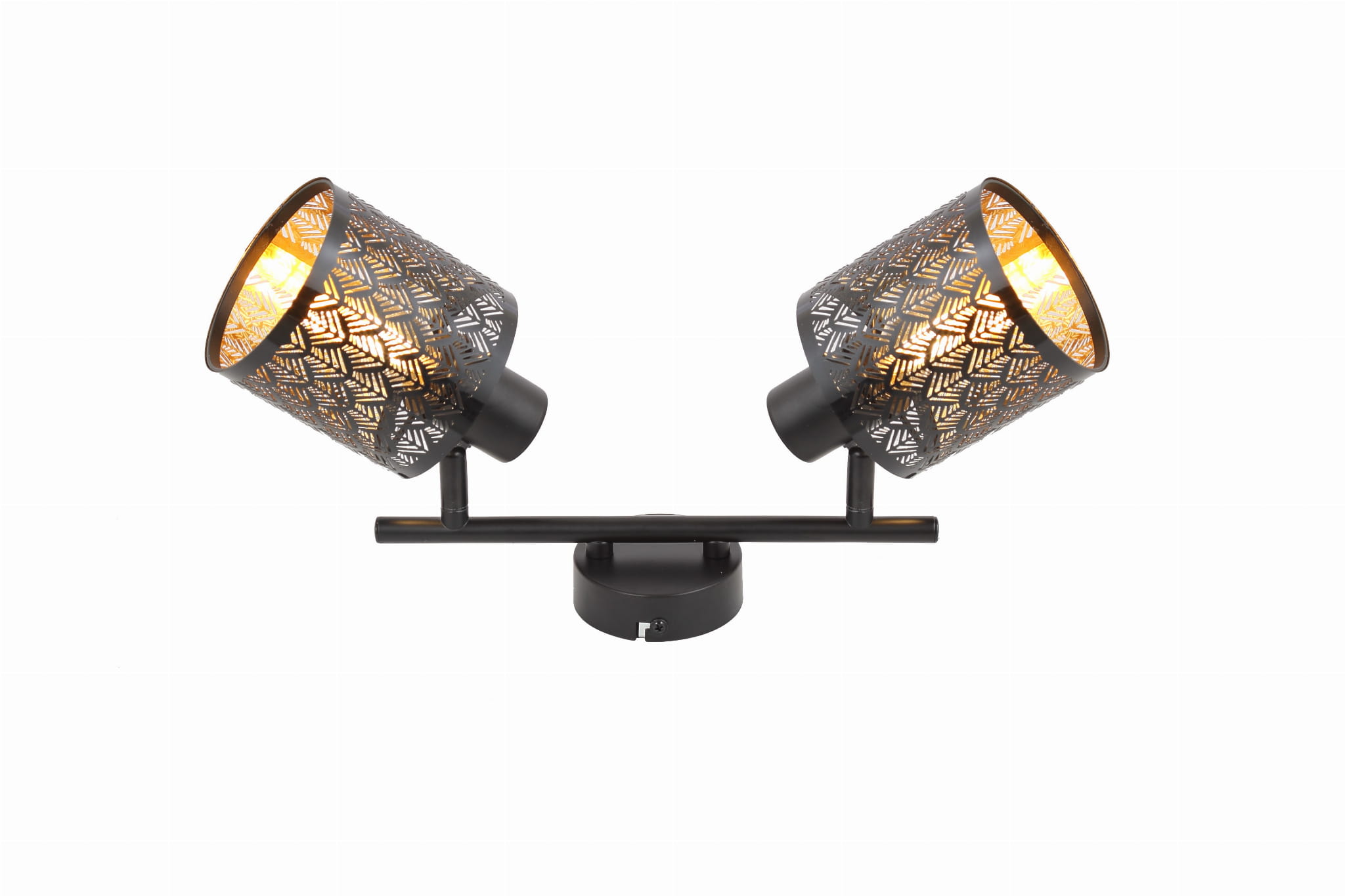 Tuluza - listwa 2 płomienna czarna. 2xE14 40W. Wysokość 15,5cm. Szerokość 25cm. Głębokość 10cm. Abażury z tworzywa sztucznego czarny wewnątrz złoty